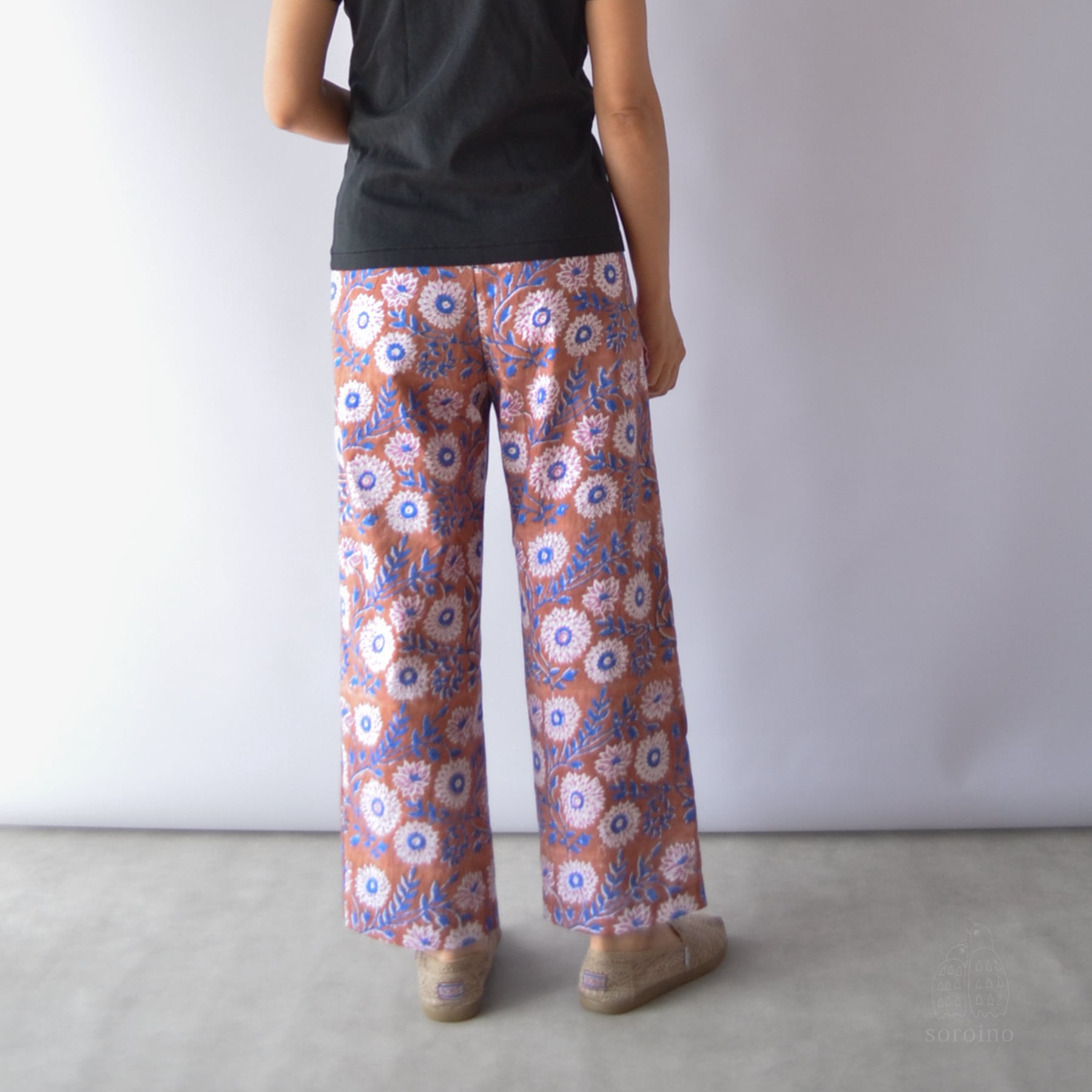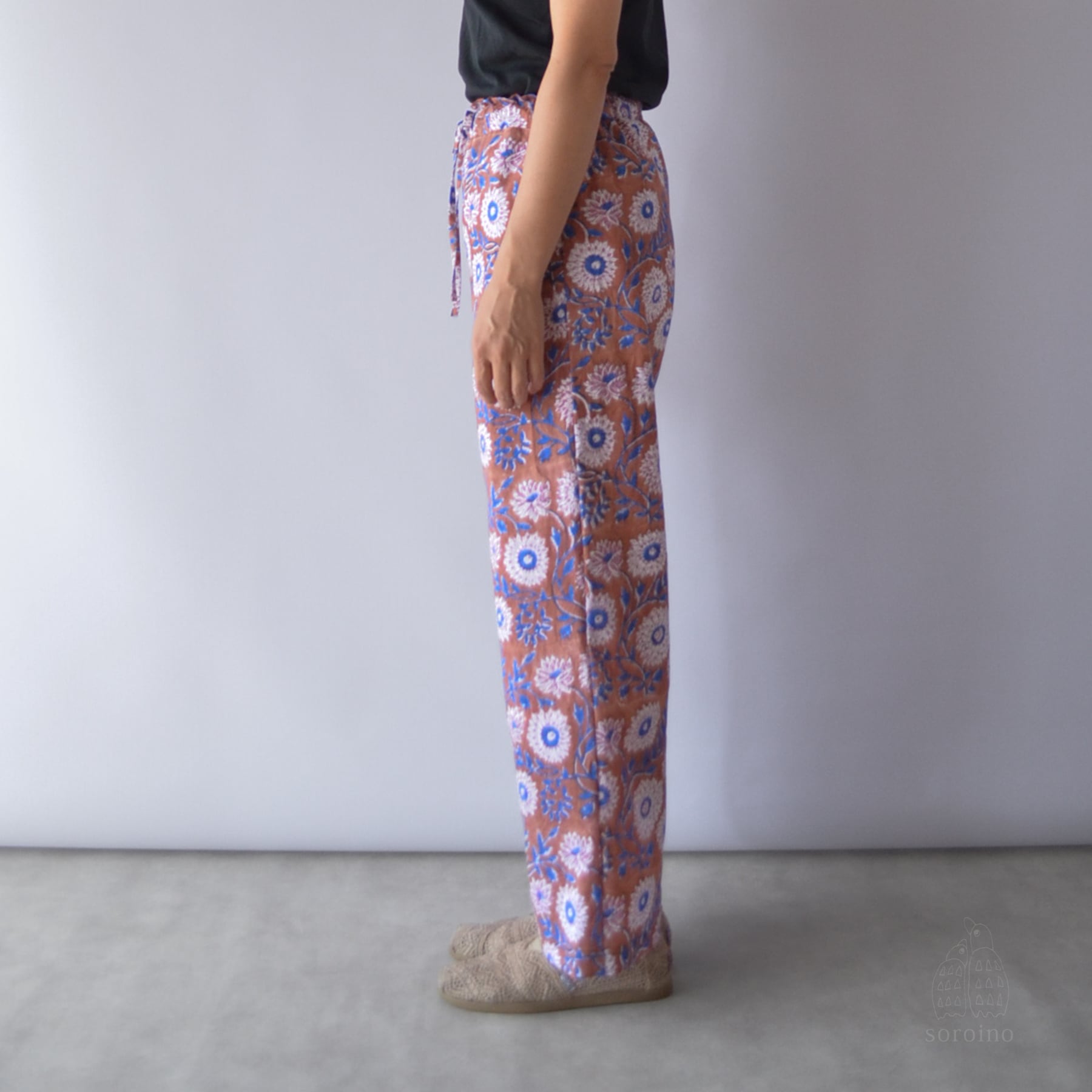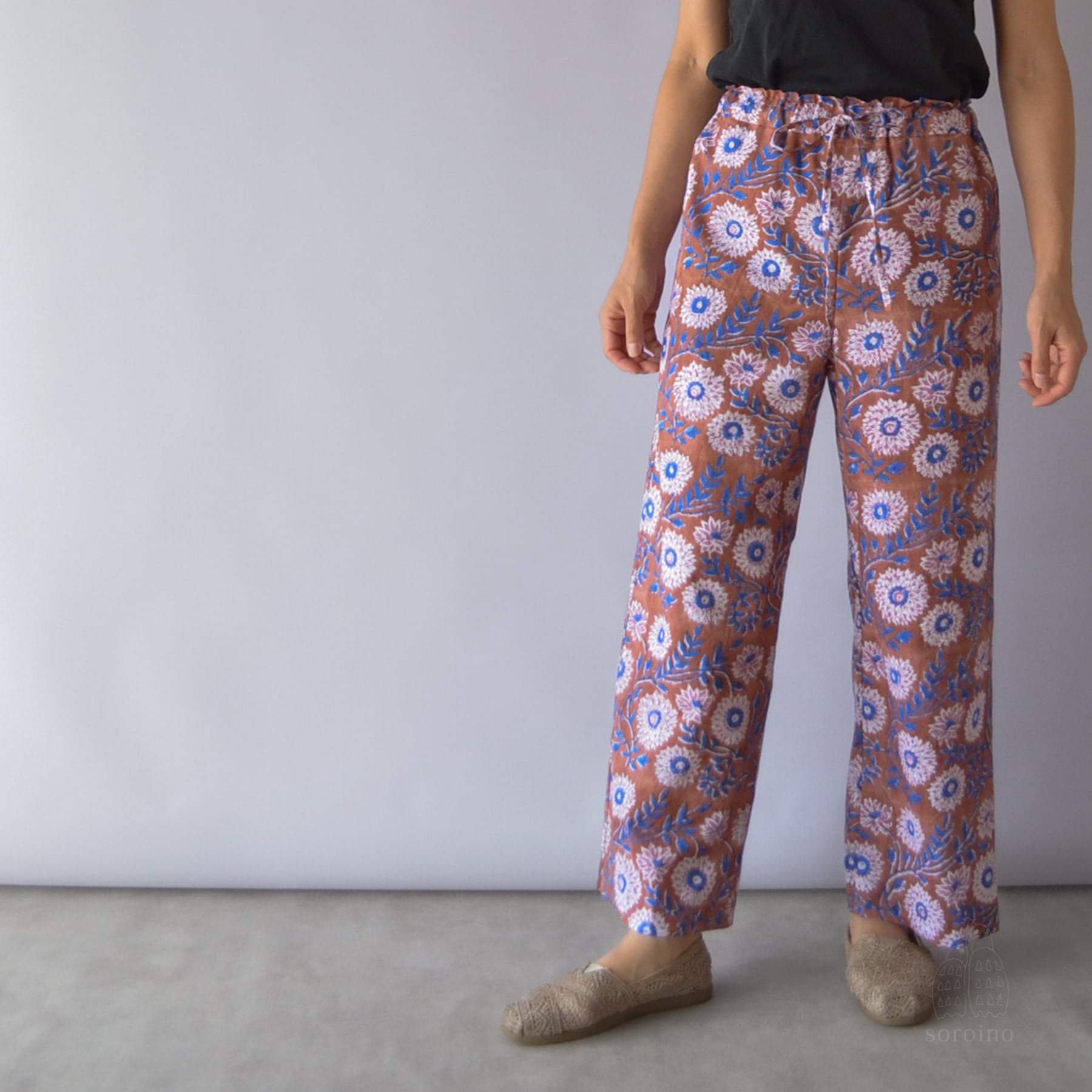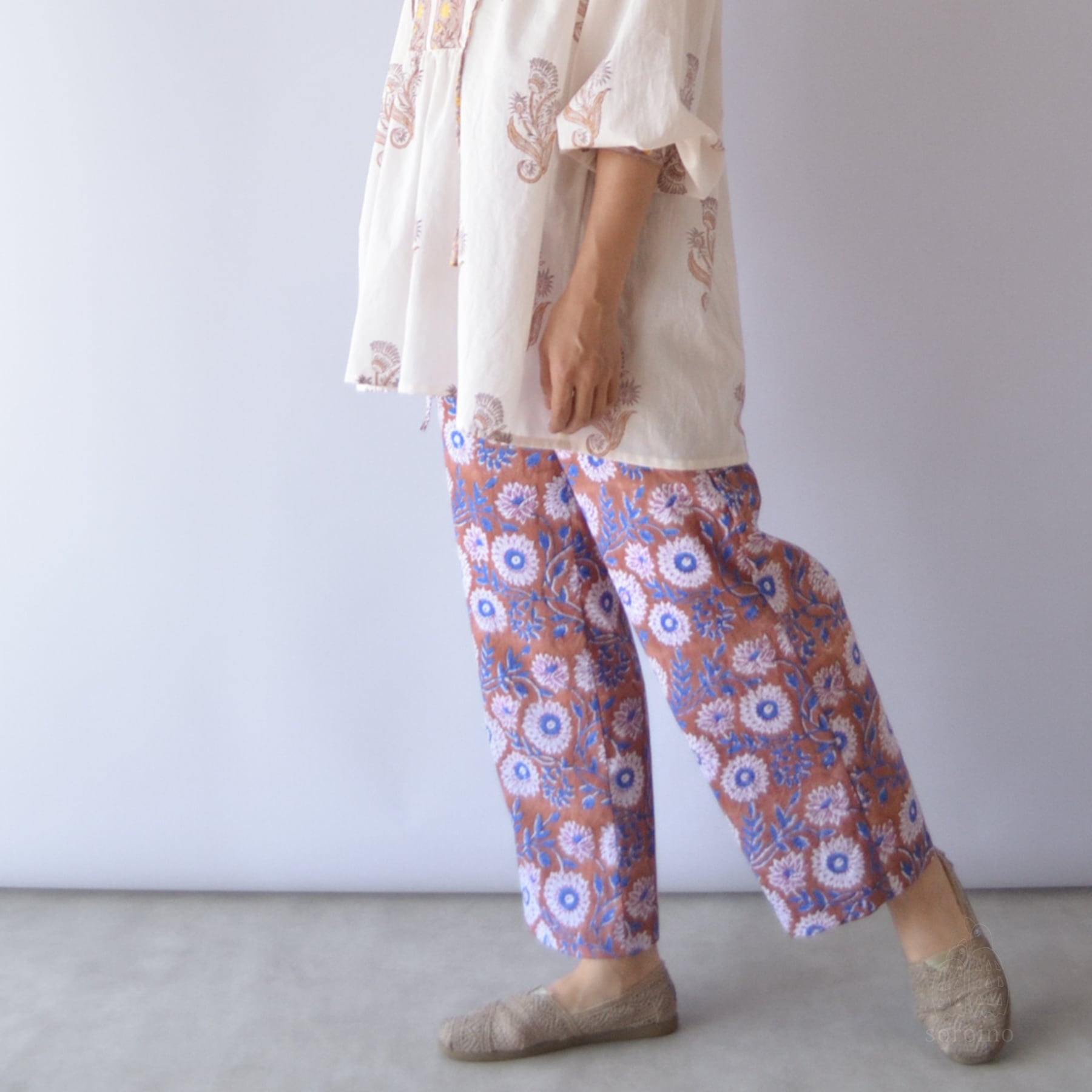 【限定1点】リラックスコットンパンツ ブロックプリント ブラウン