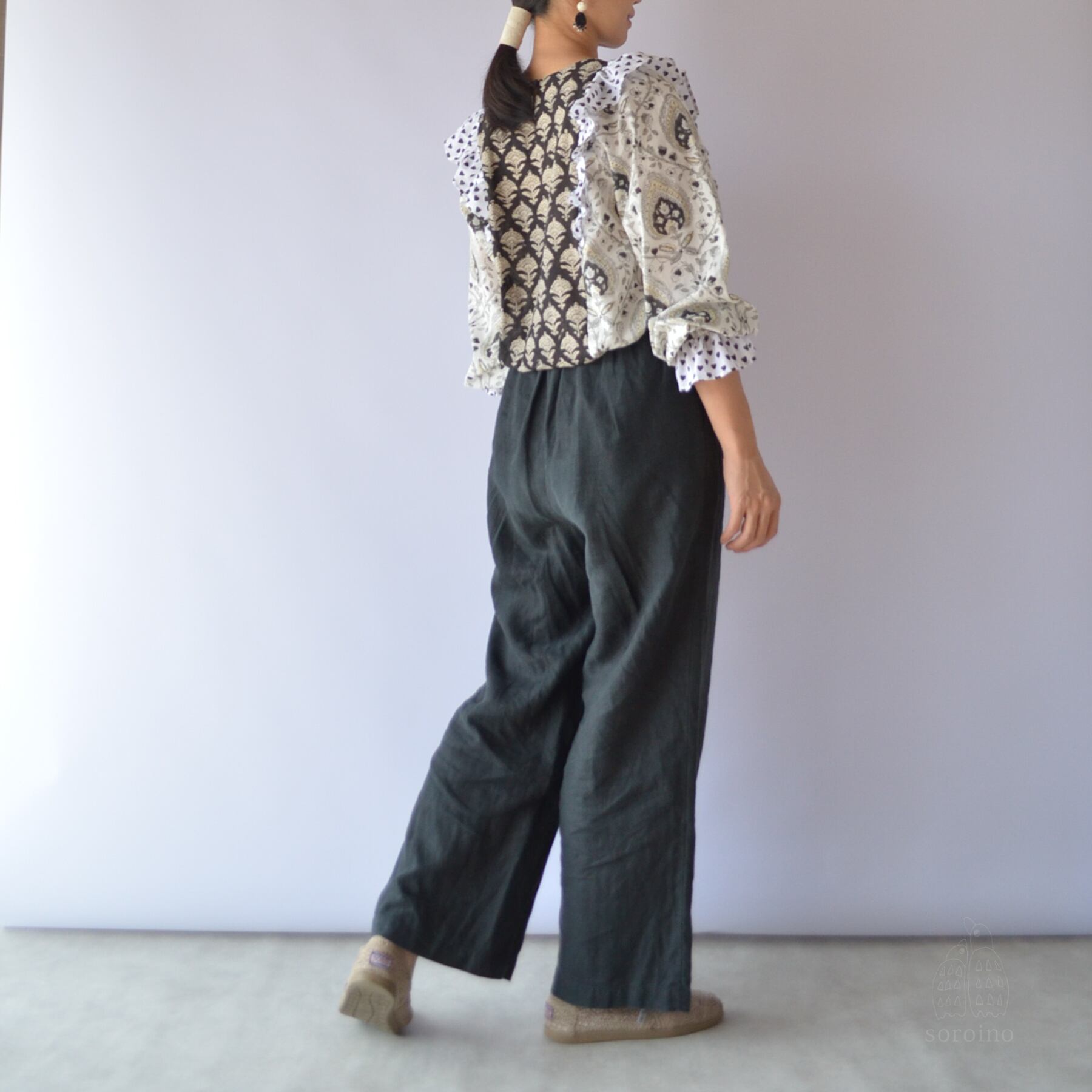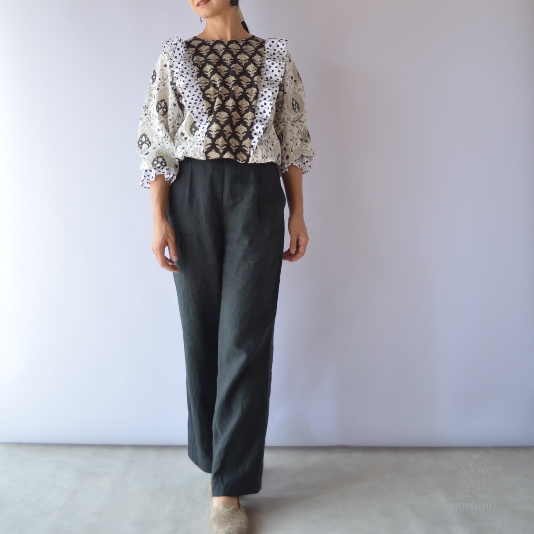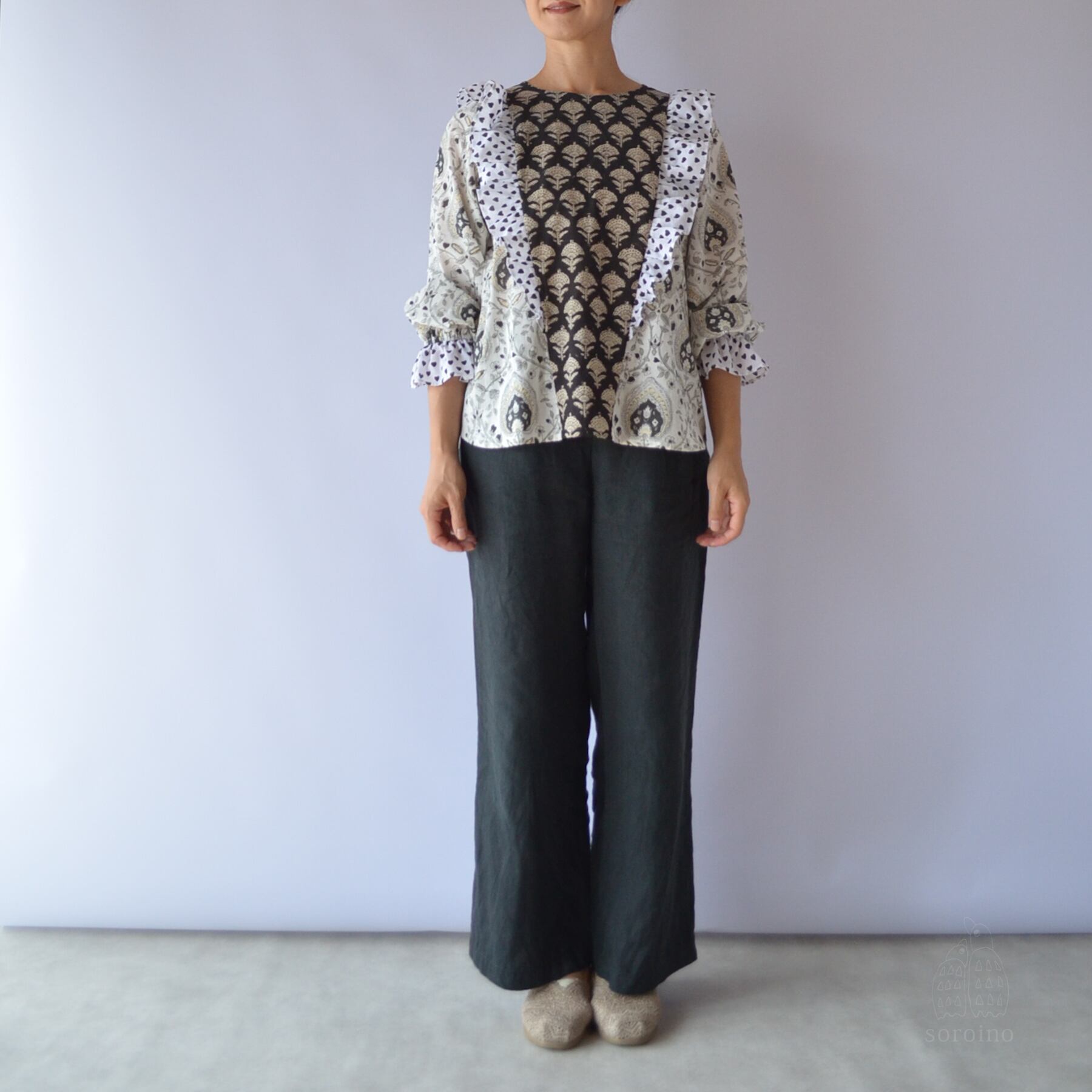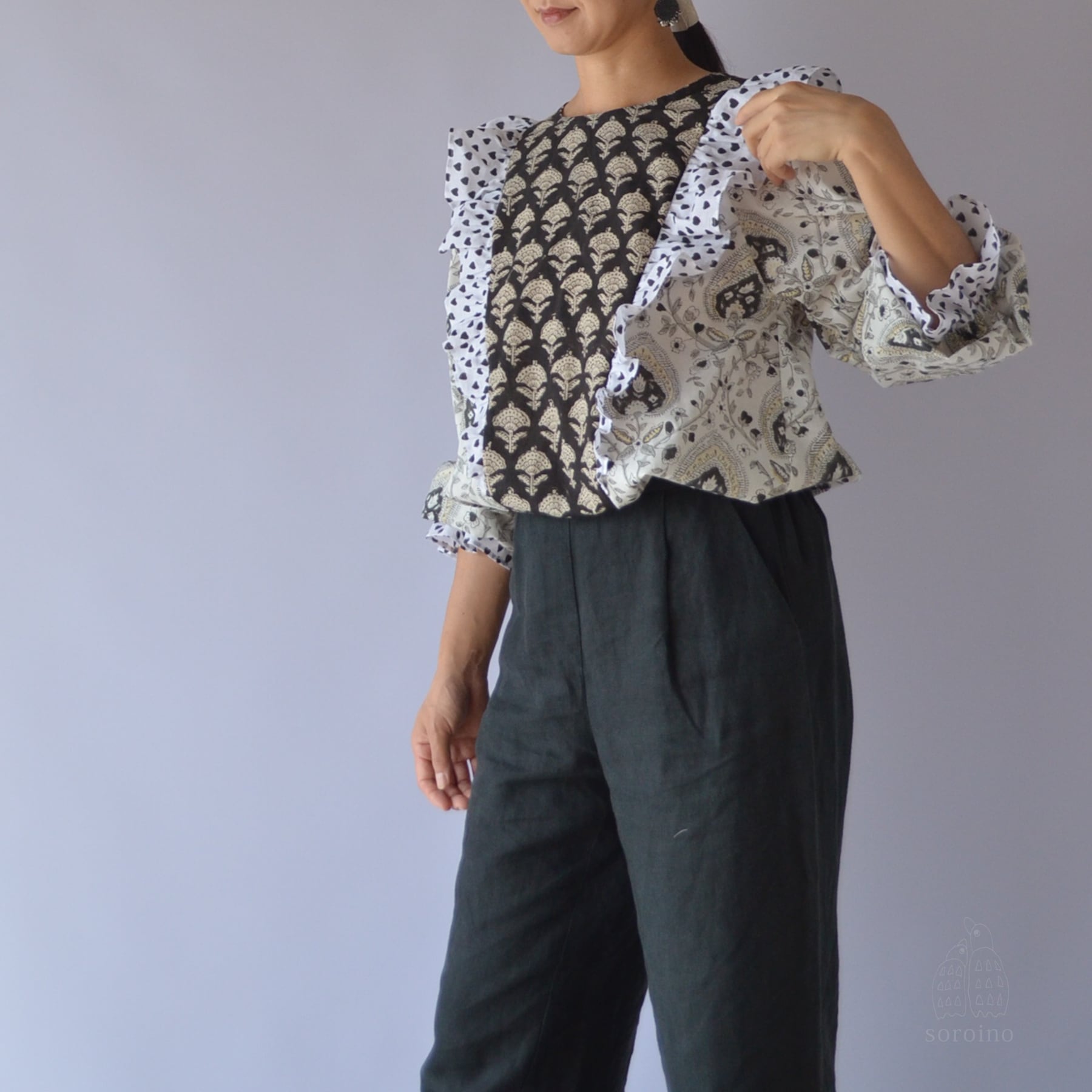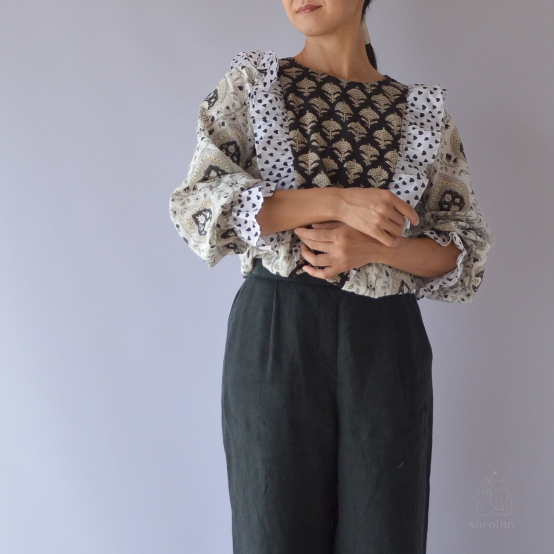 【限定1点】モノトーンのフリルブラウス|花柄ブロックプリント
