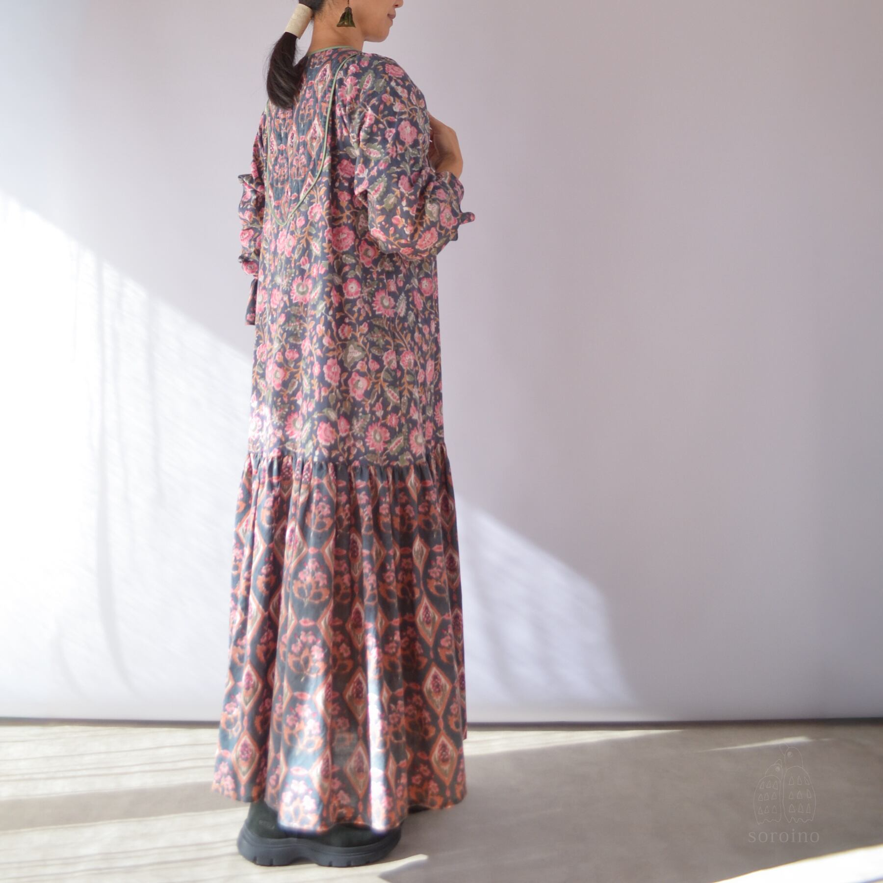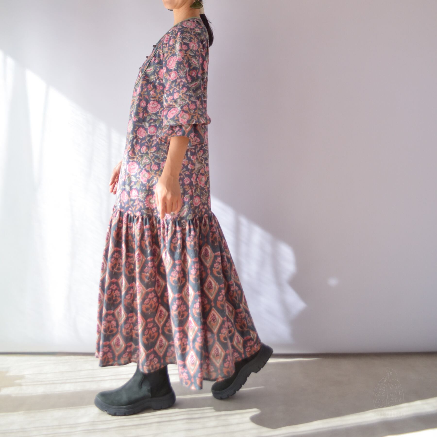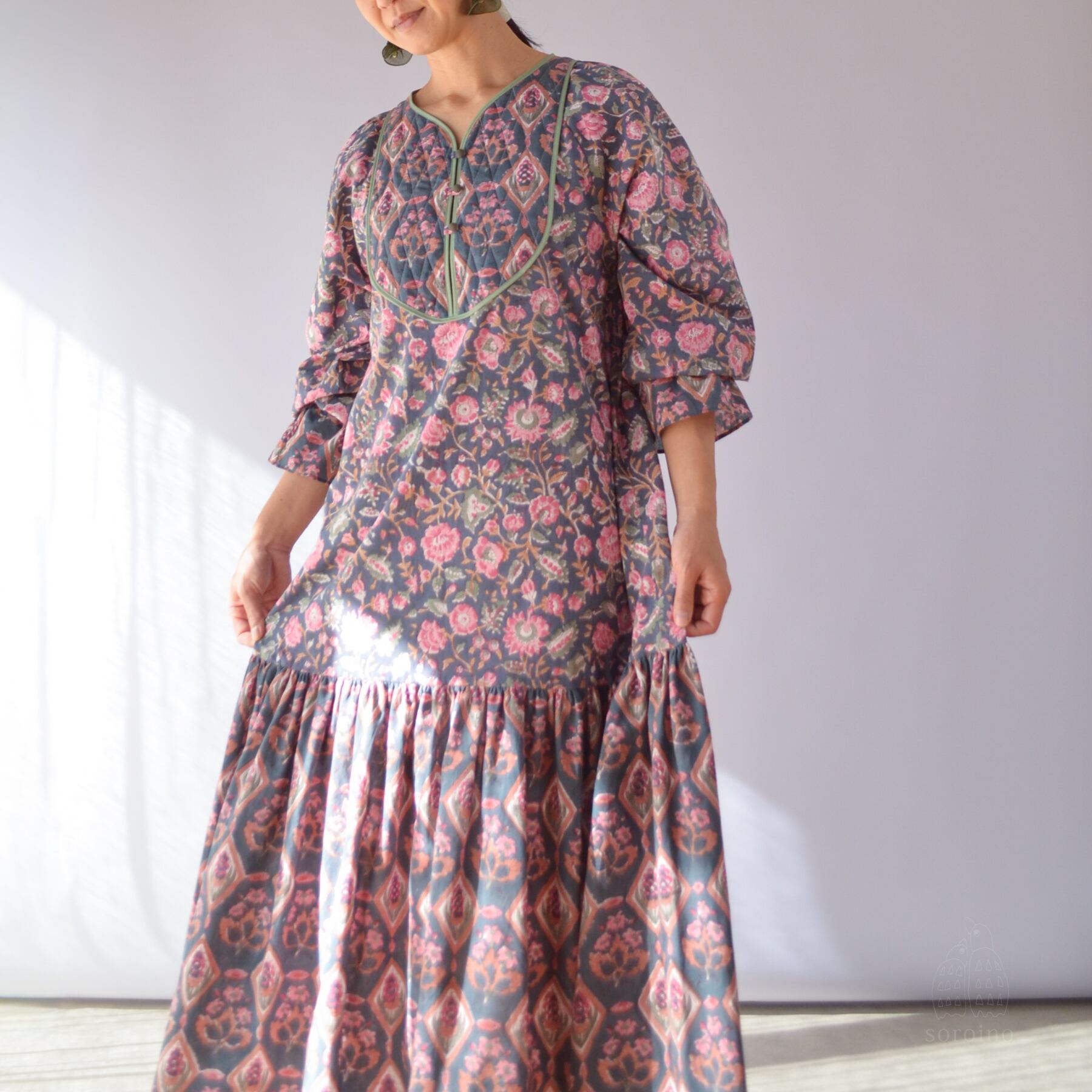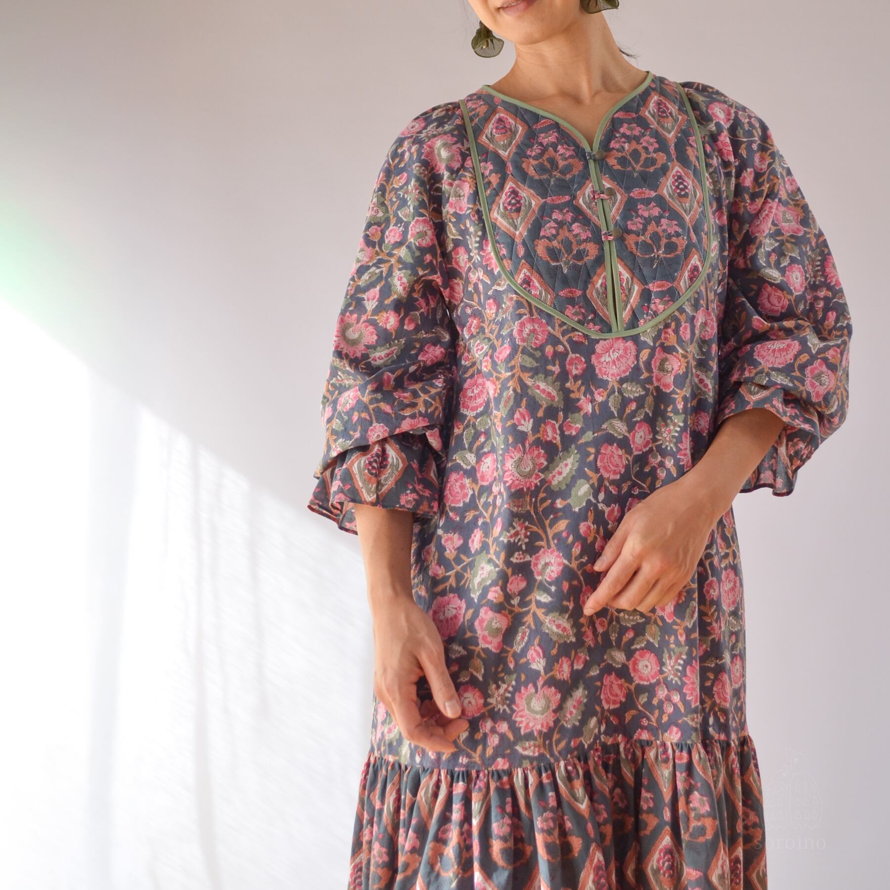 【1点限り】銀糸のキルティングを施したブロックプリントワンピース【丈のお直しOK】 長袖 花柄 ネイビー&ピンク
