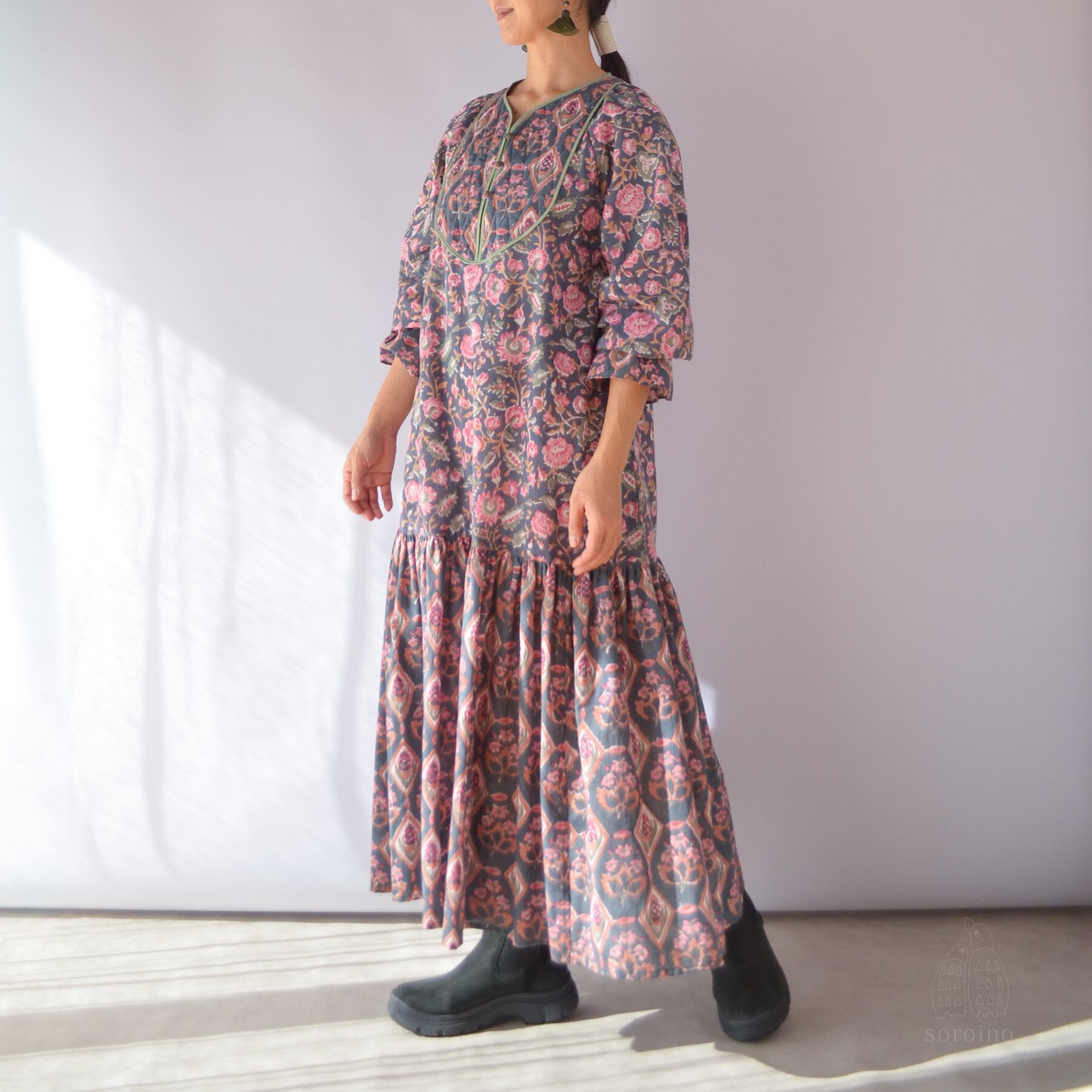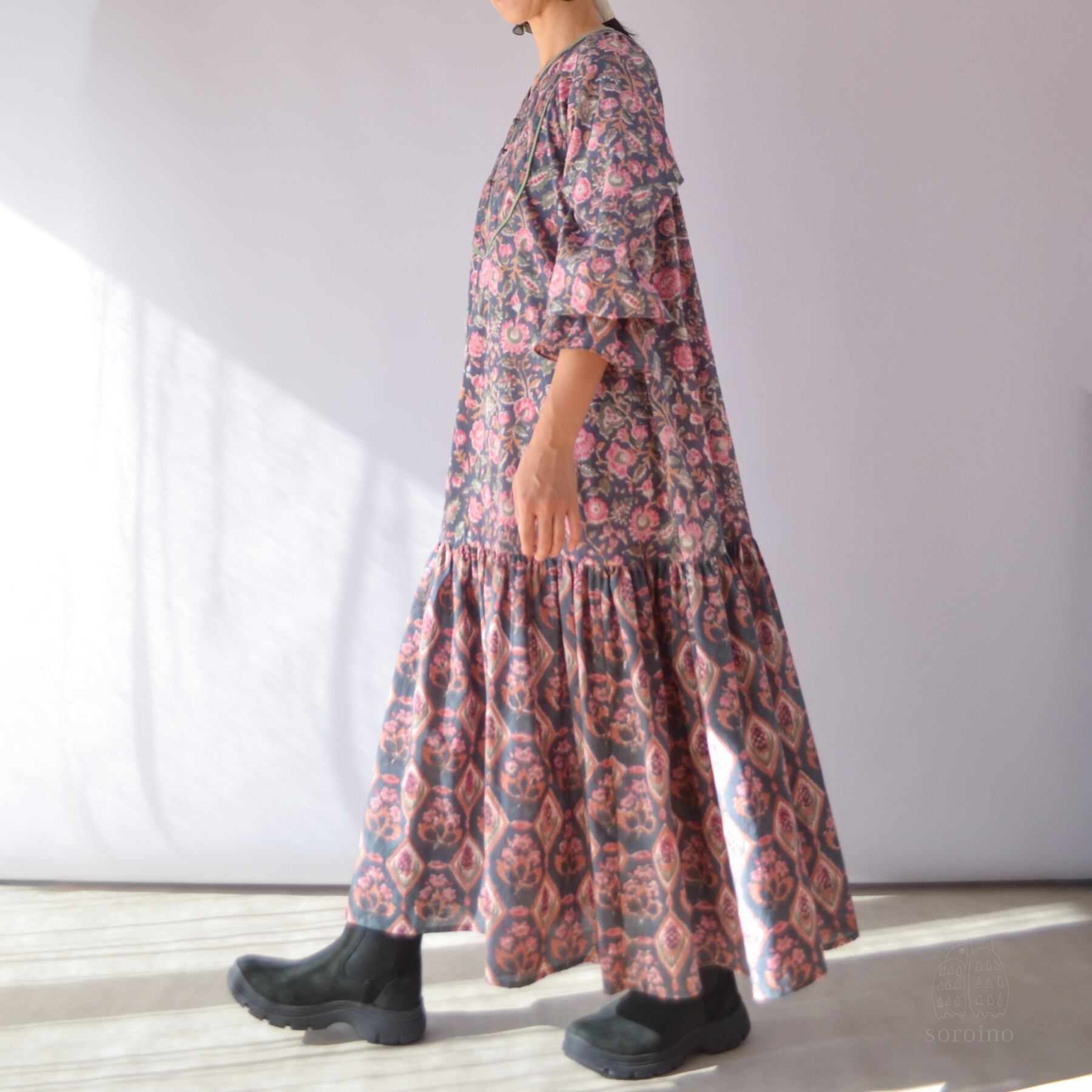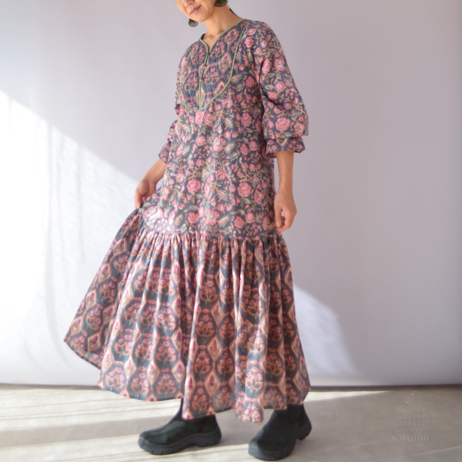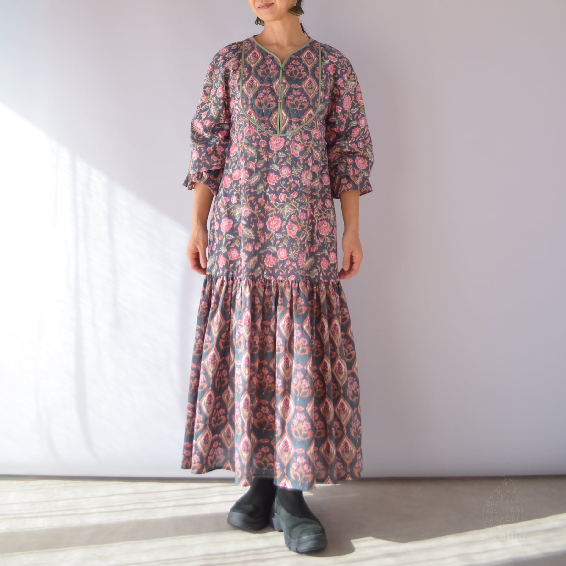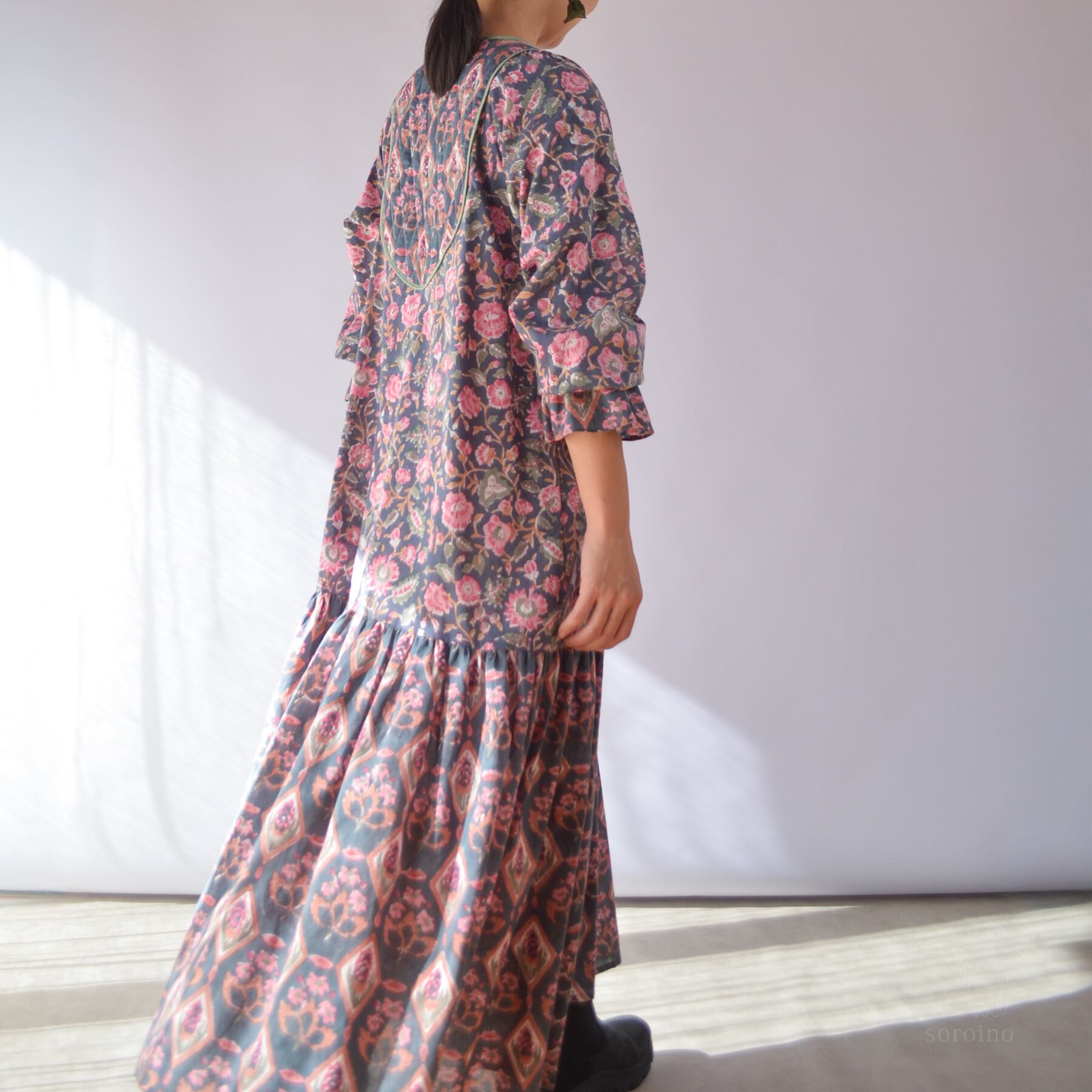【1点限り】銀糸のキルティングを施したブロックプリントワンピース【丈のお直しOK】 長袖 花柄 ネイビー&ピンク