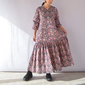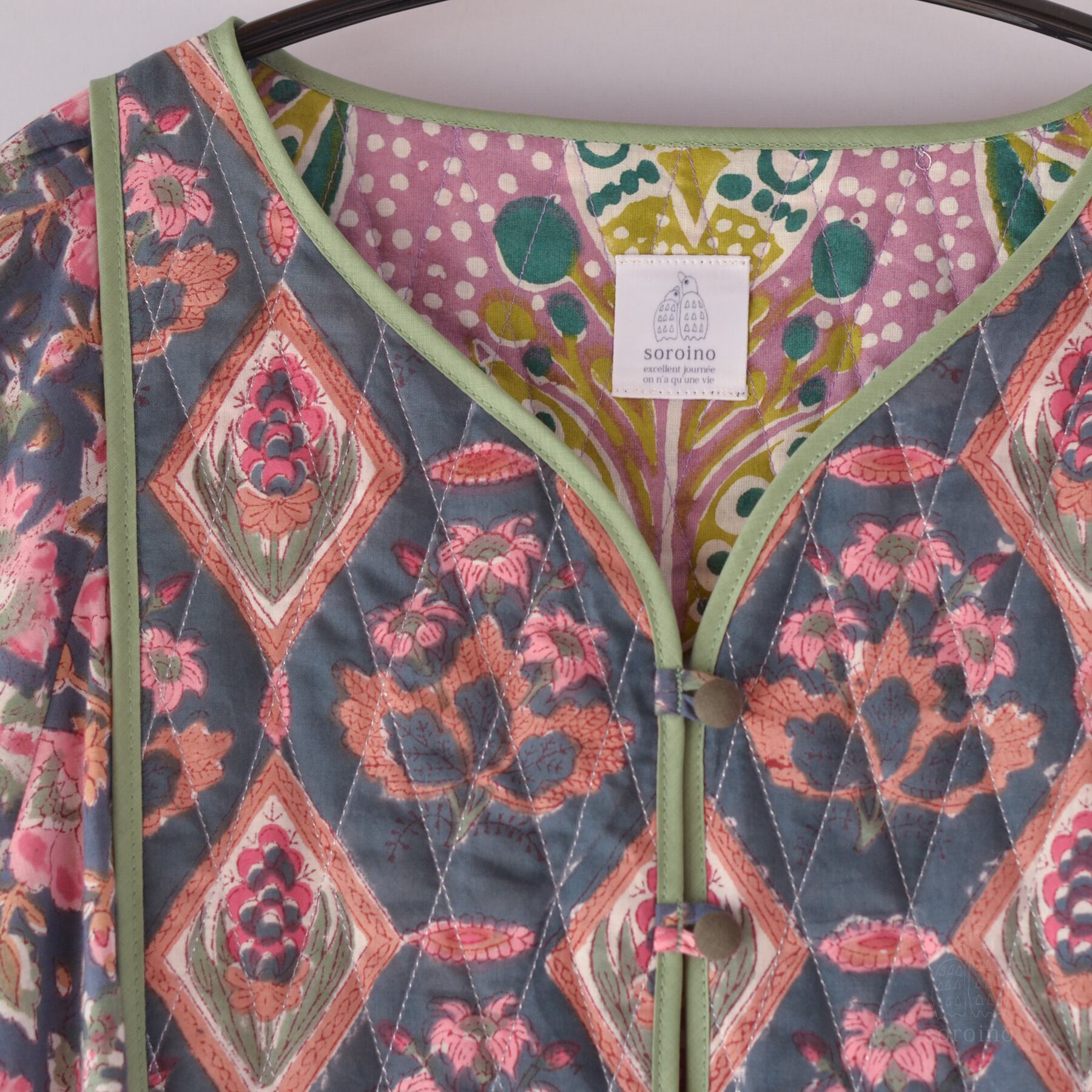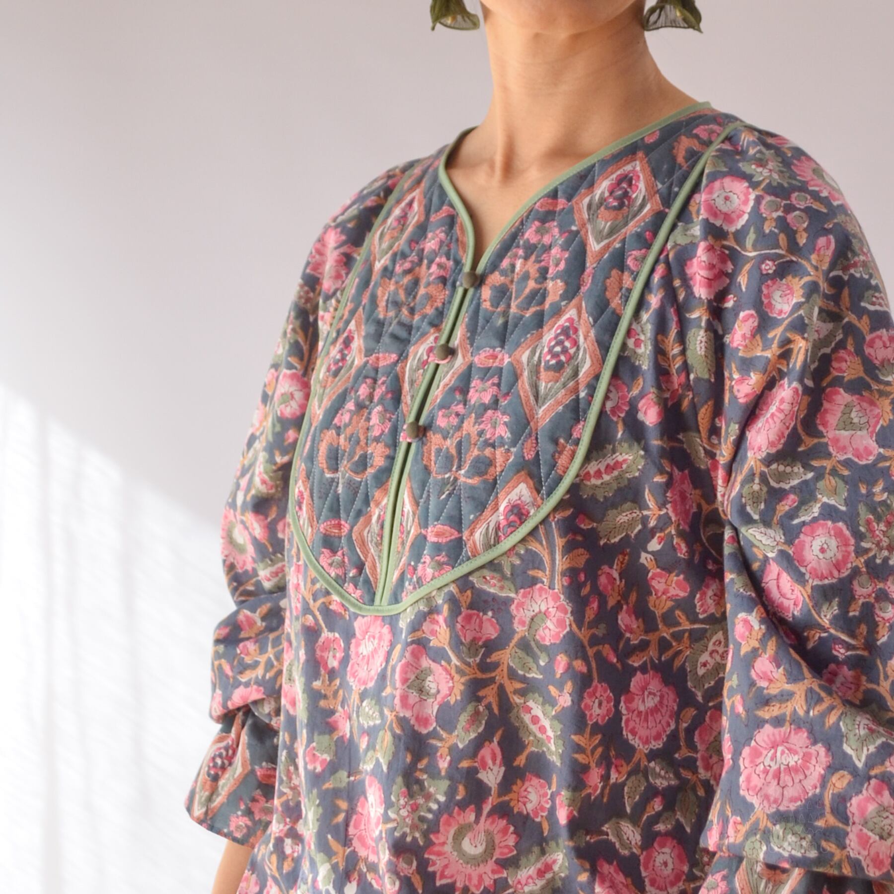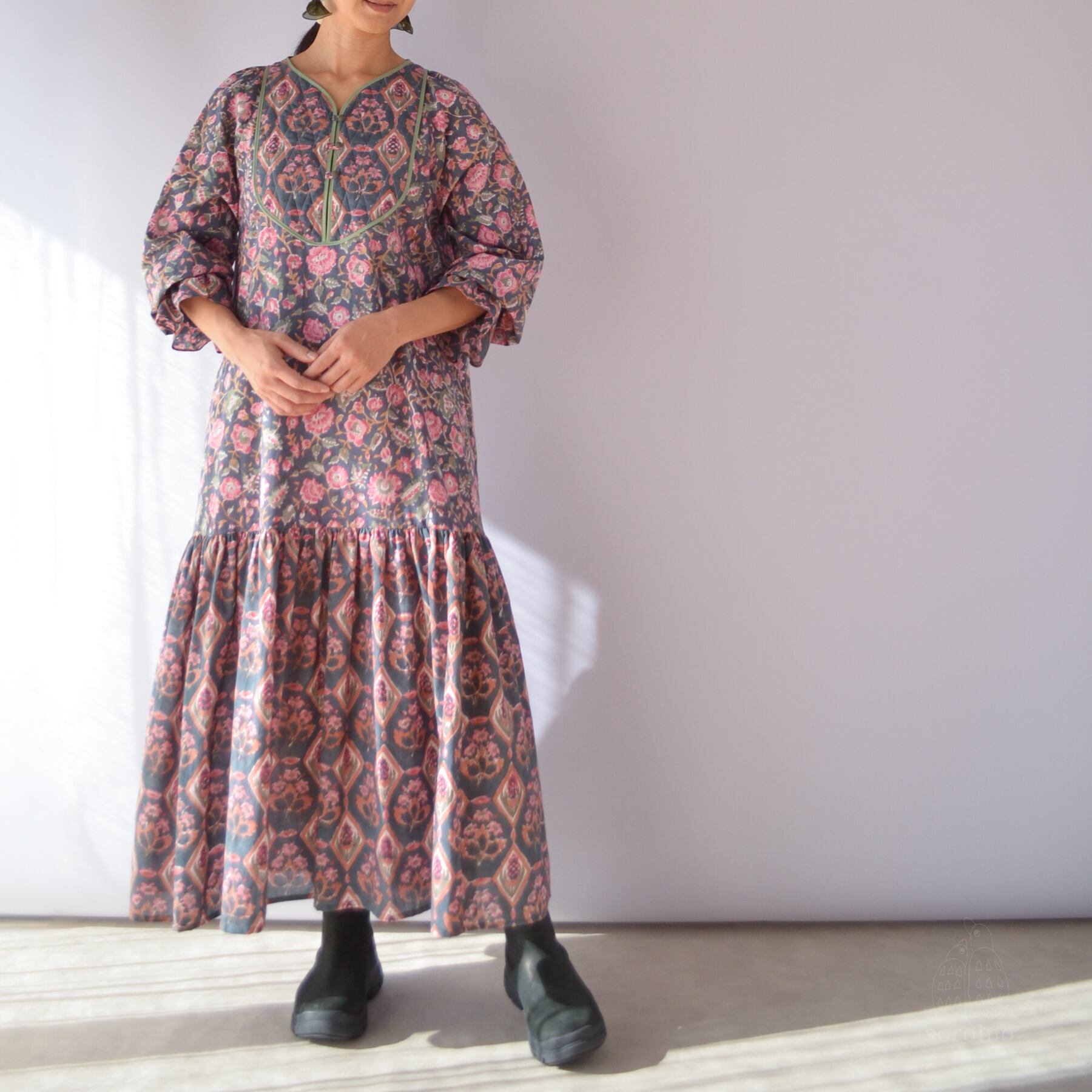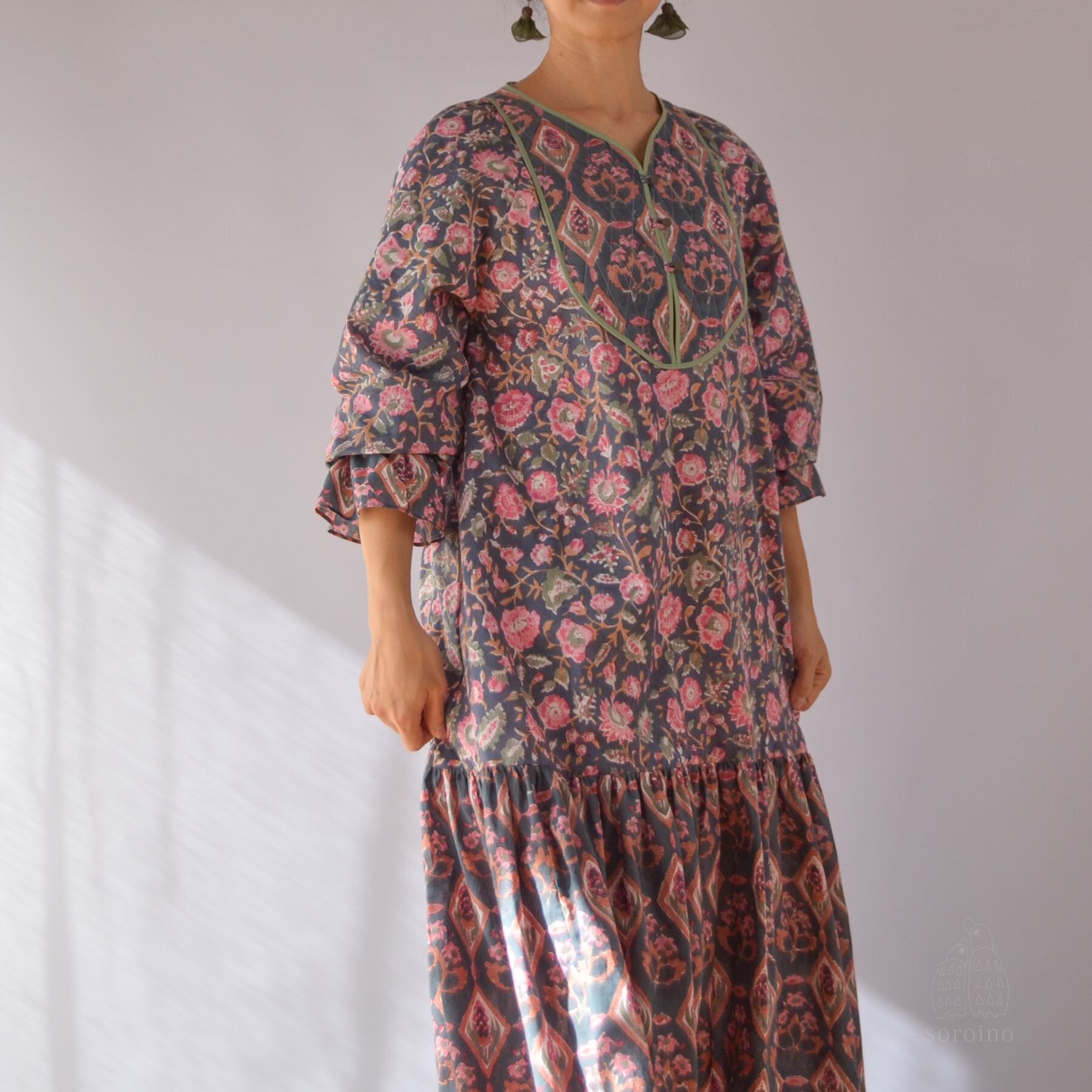 【1点限り】銀糸のキルティングを施したブロックプリントワンピース【丈のお直しOK】 長袖 花柄 ネイビー&ピンク