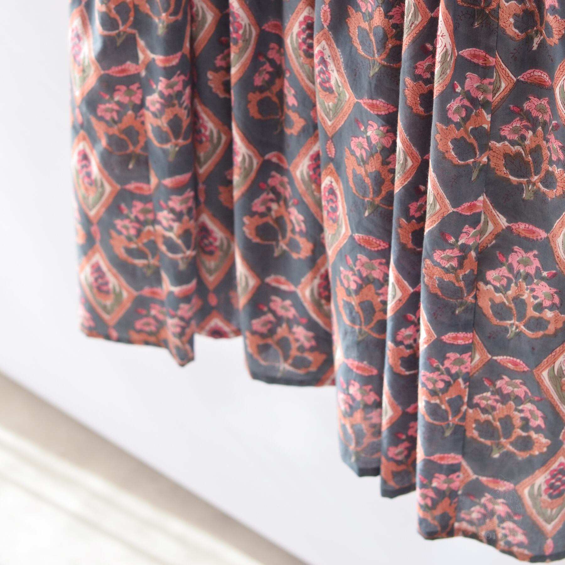 質の良い綿織物として 昔から愛されるインド綿に、職人さんが木版で 一色一色プリントを施した“ブロックプリント”と呼ばれる生地を使用。