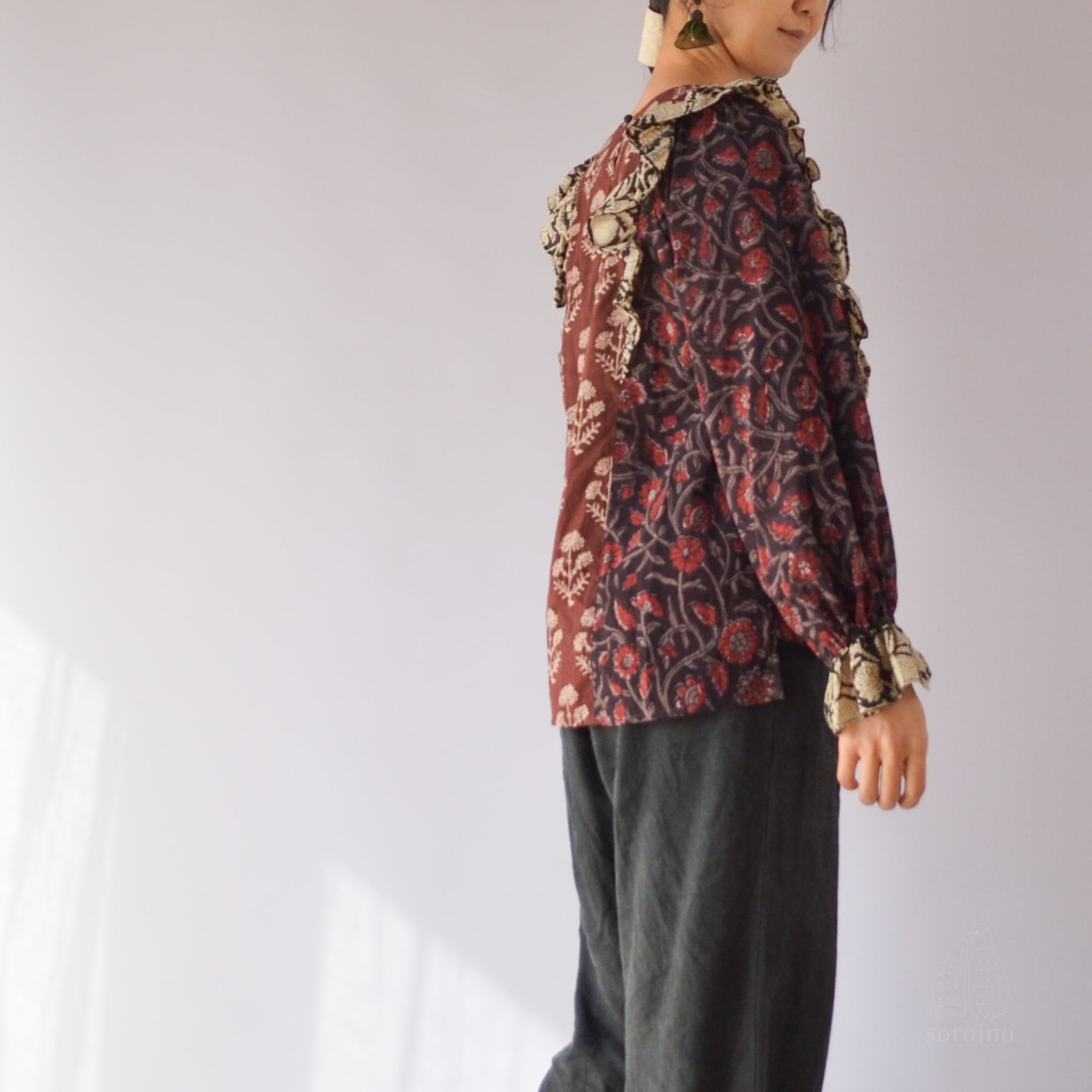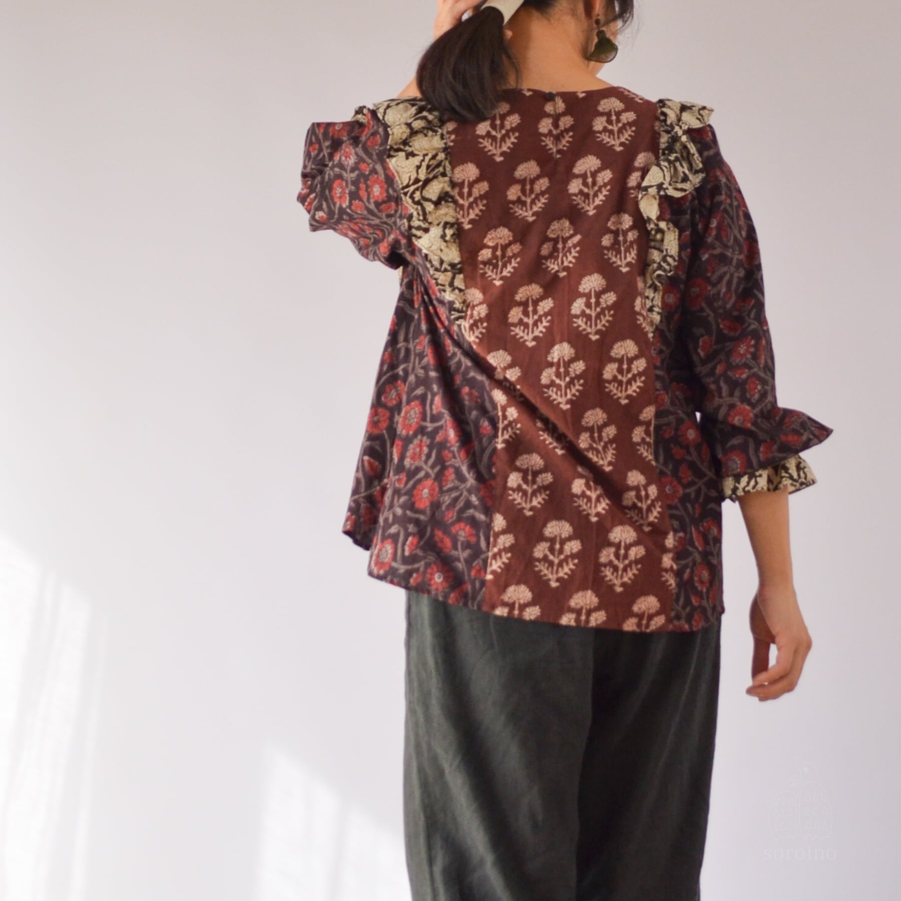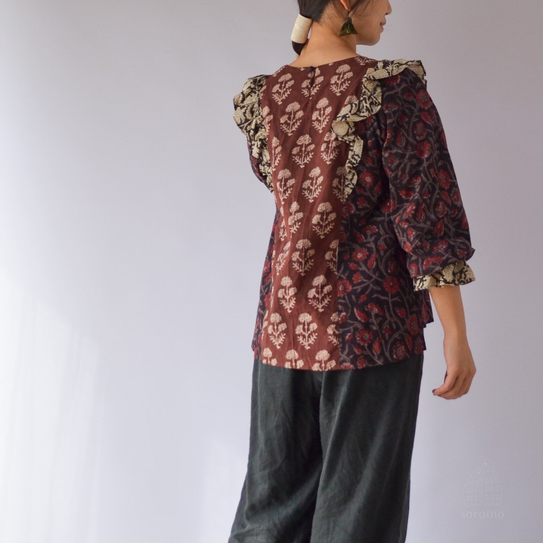 【1点限り】こっくりとしたブラウンレッドのフリルブラウス 花柄ブロックプリント インド綿