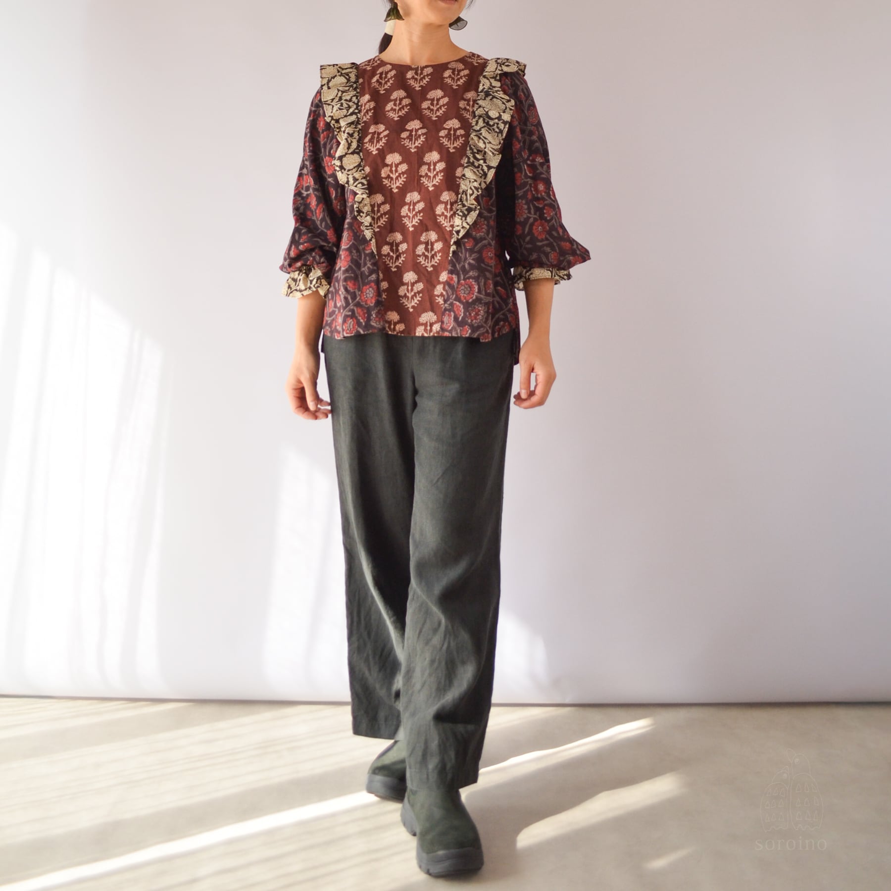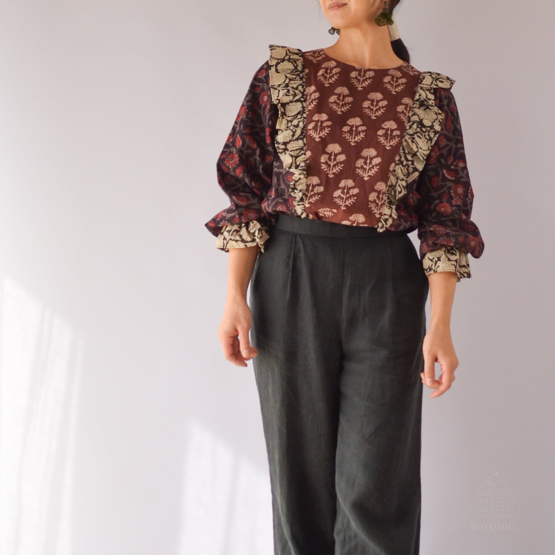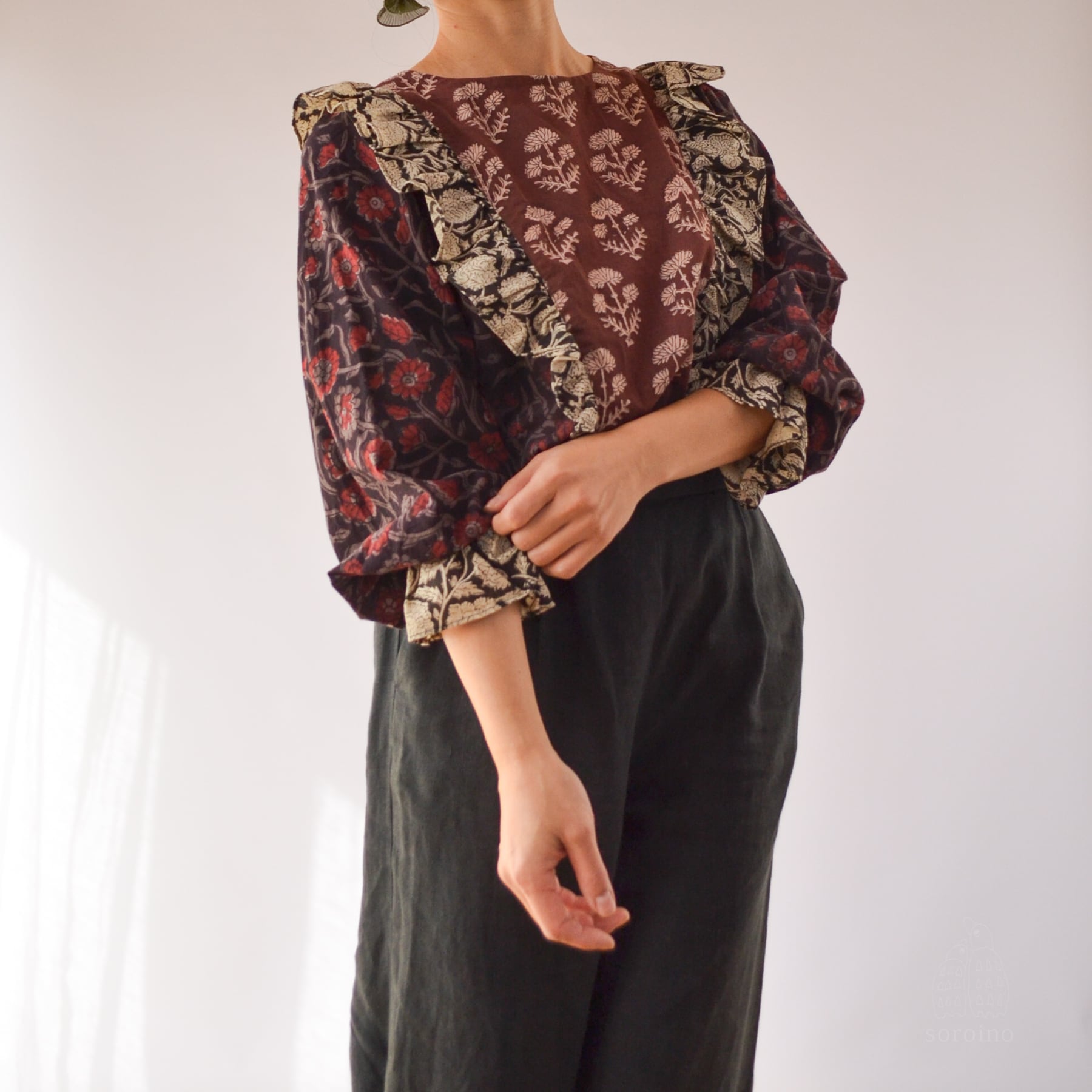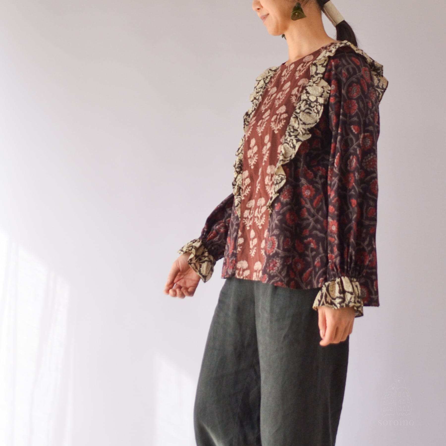 【1点限り】こっくりとしたブラウンレッドのフリルブラウス 花柄ブロックプリント インド綿