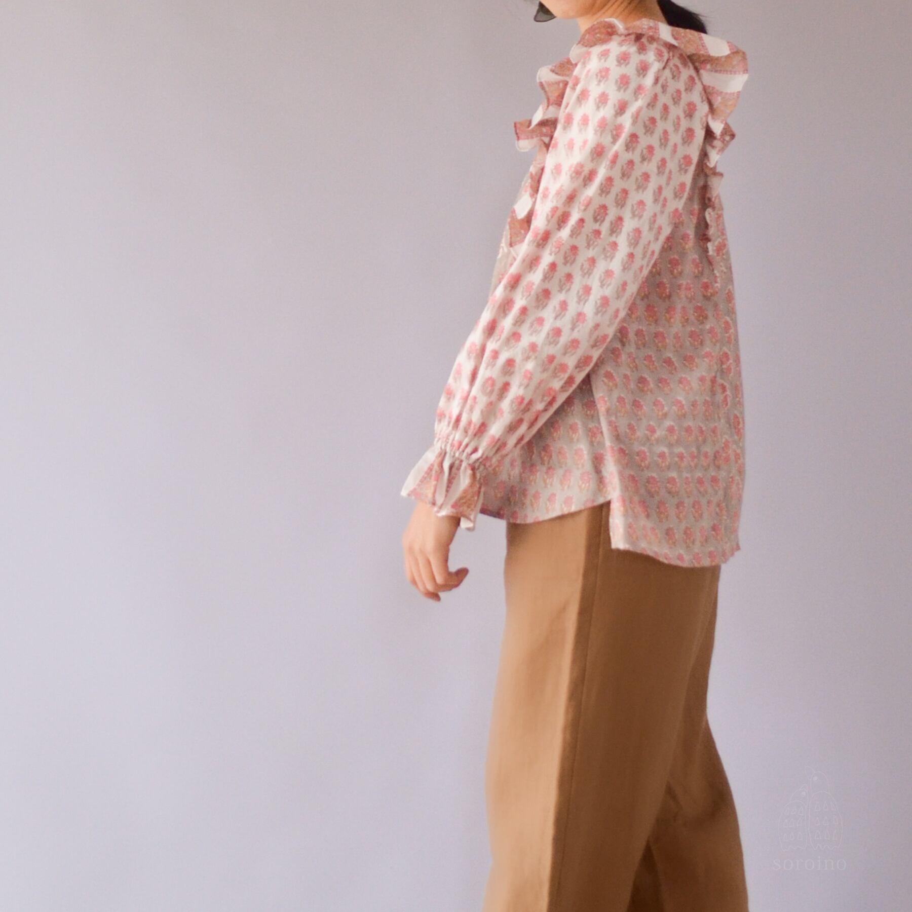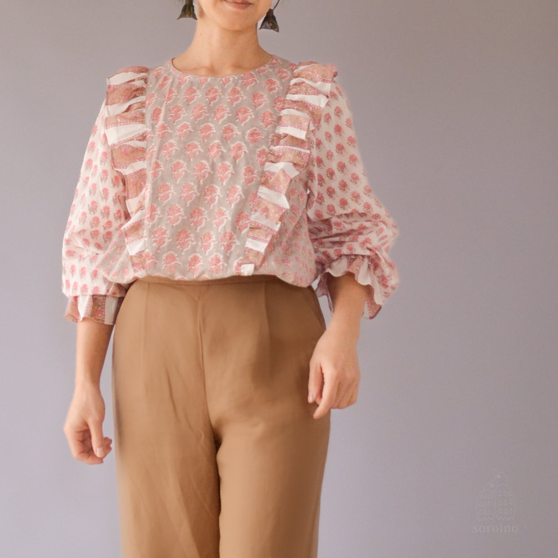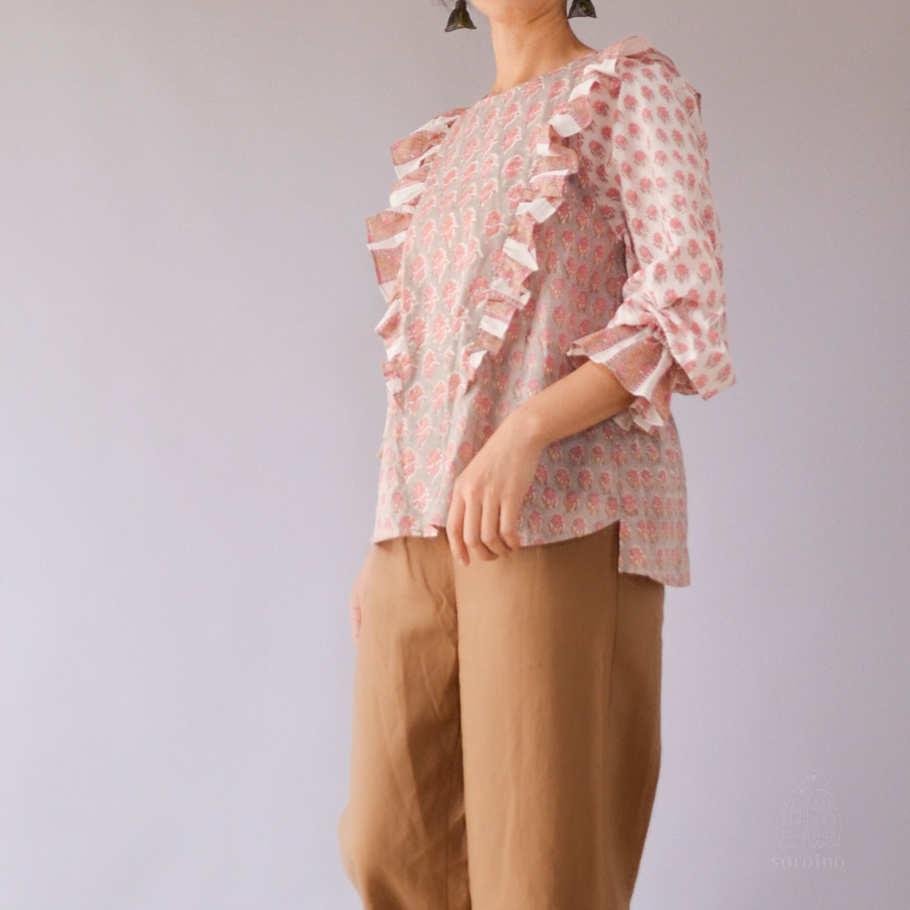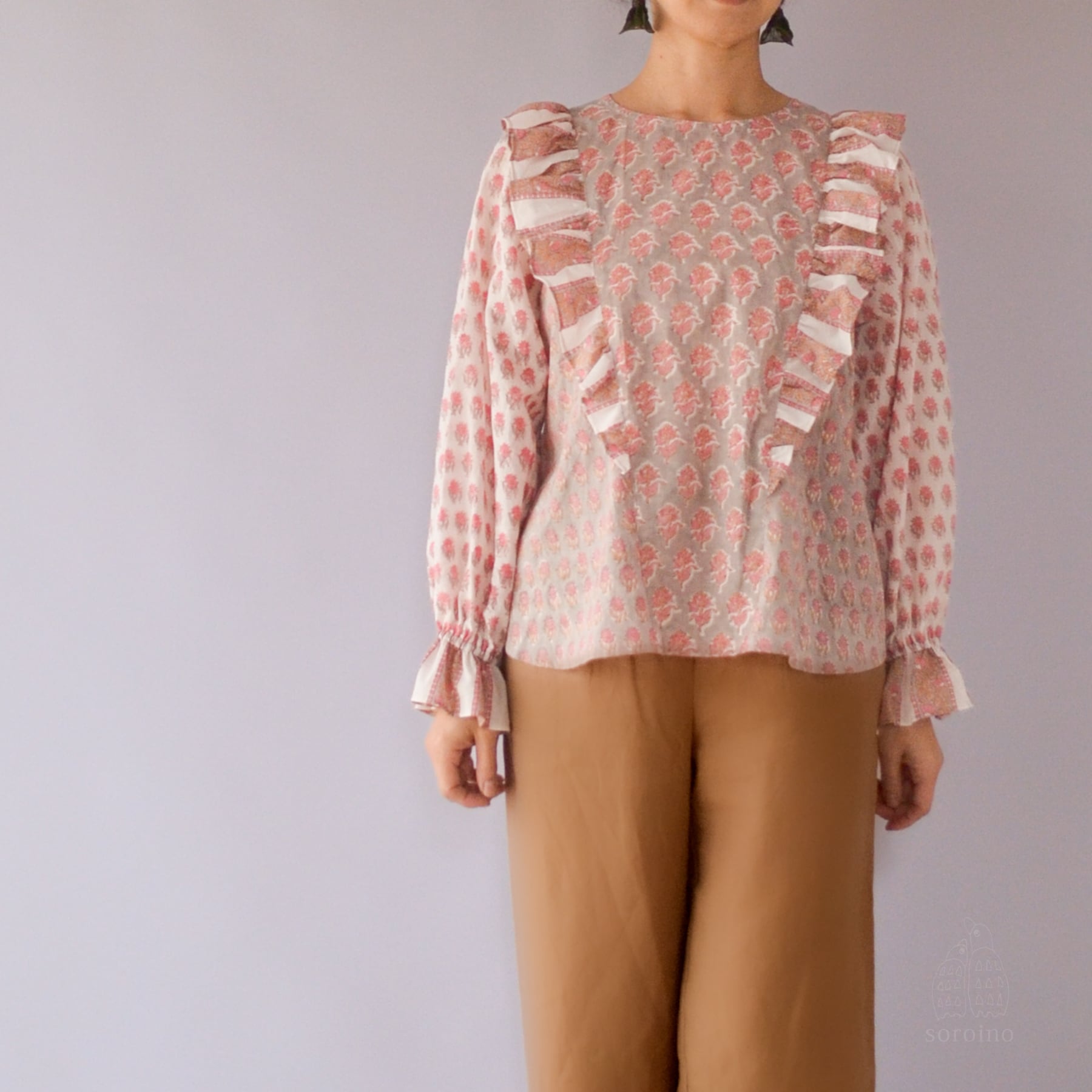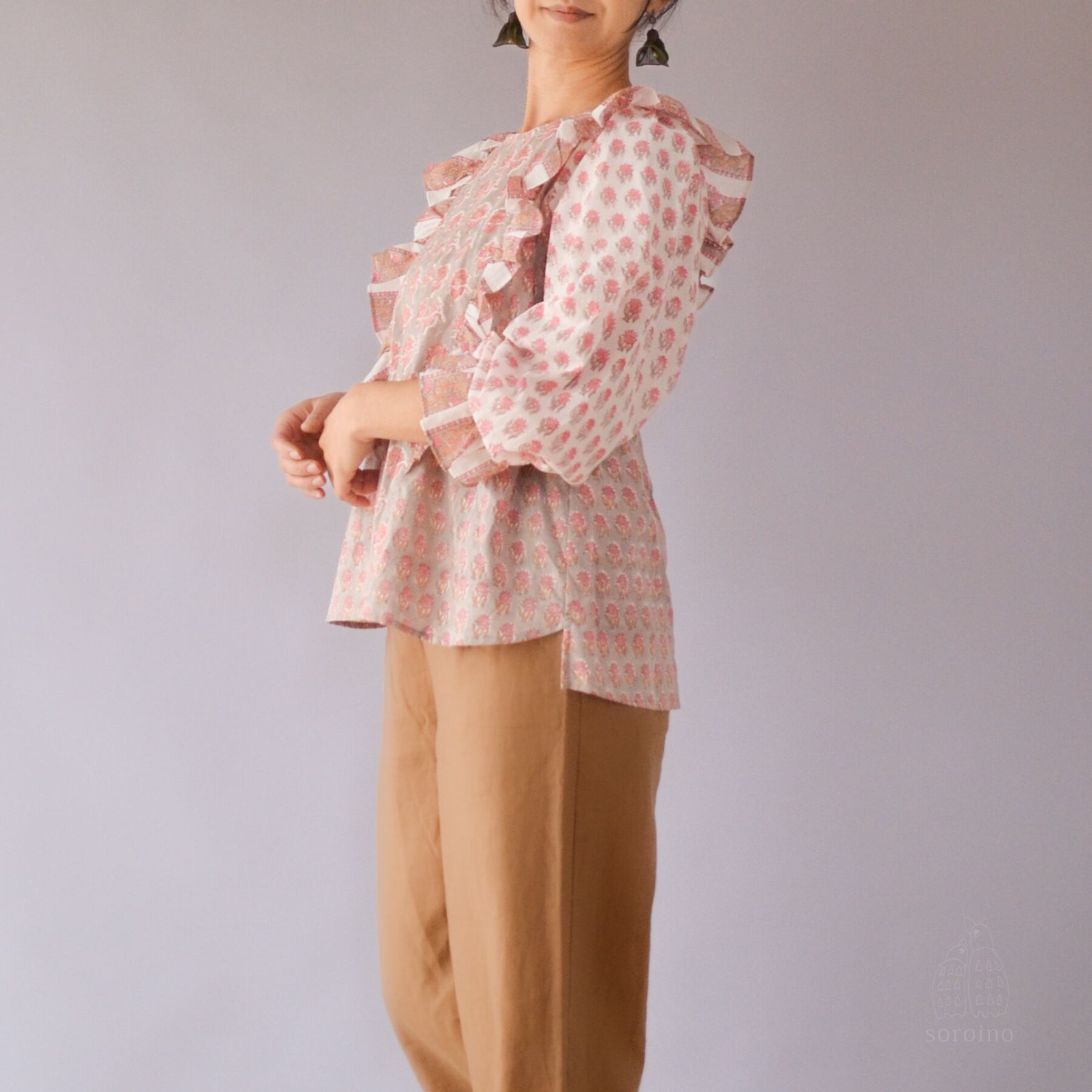【1点限り】ピンクベージュが柔らかい雰囲気のフリルブラウス 花柄ブロックプリント インド綿