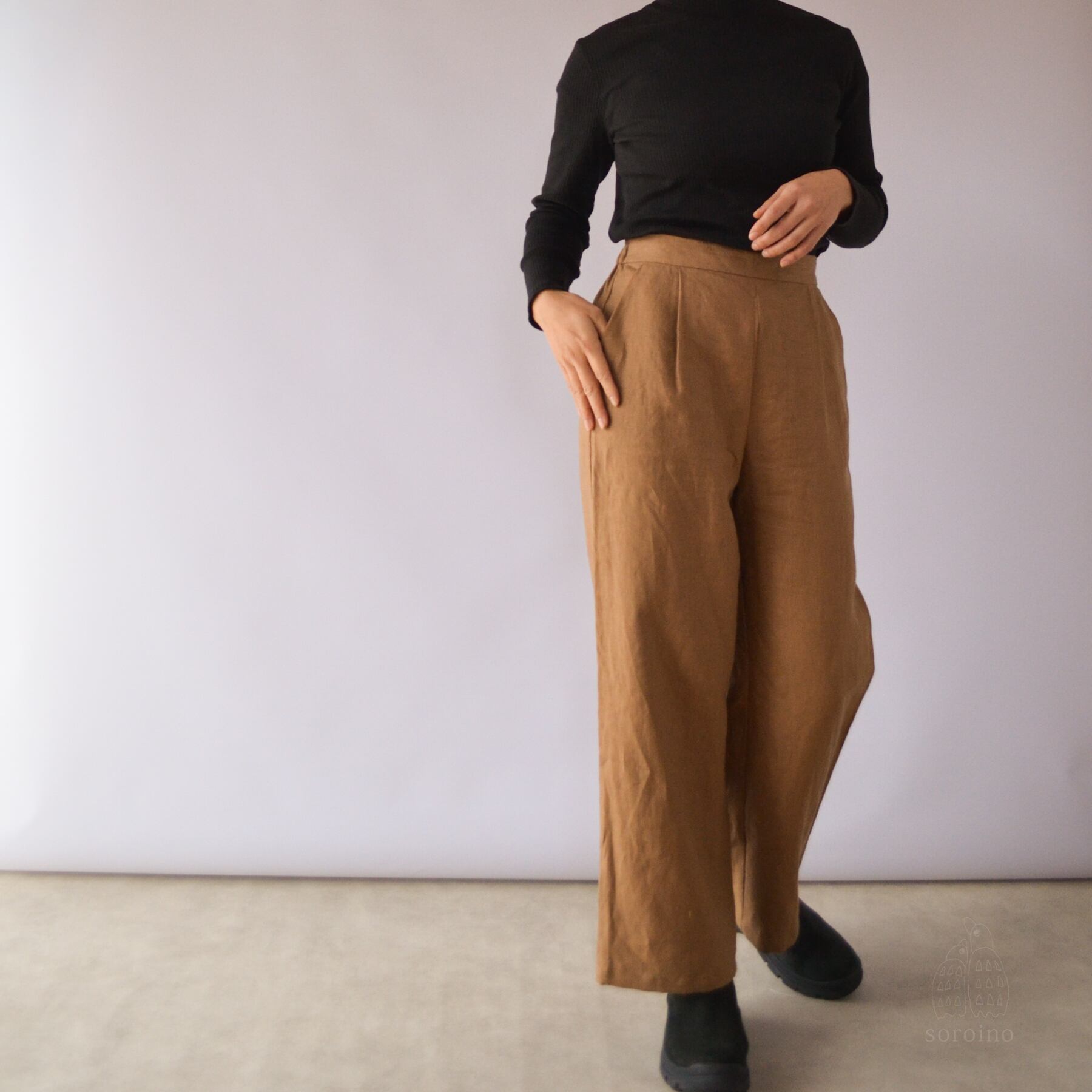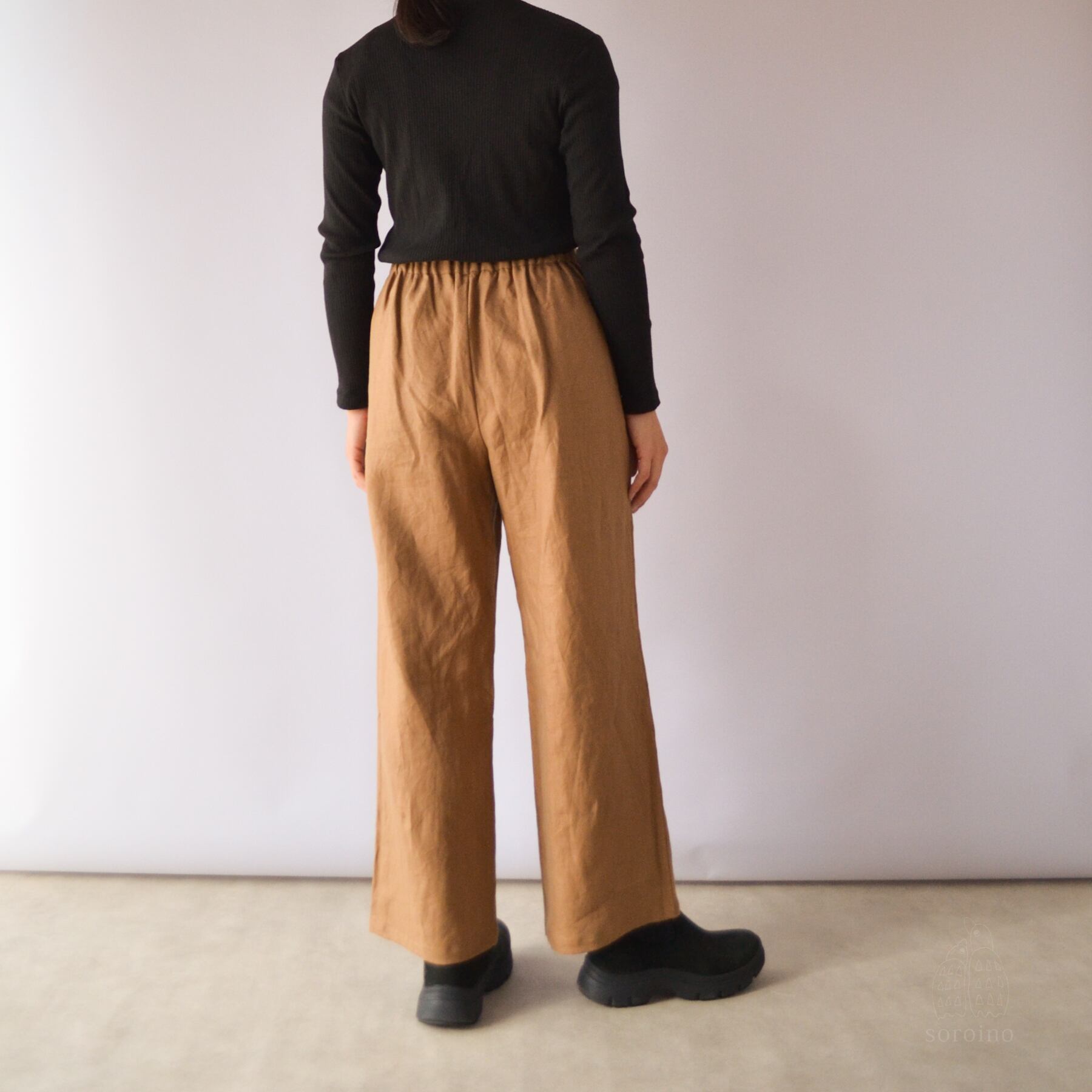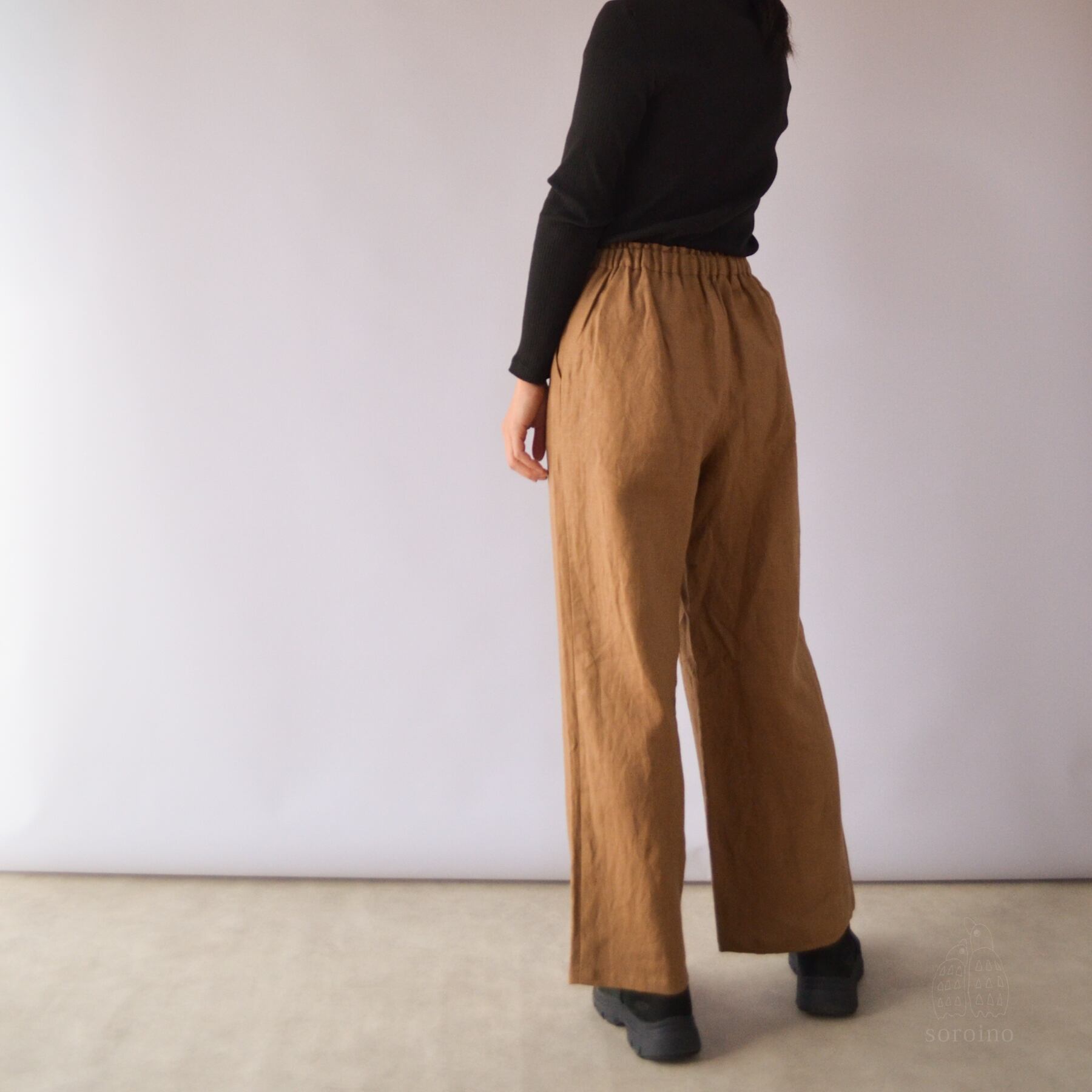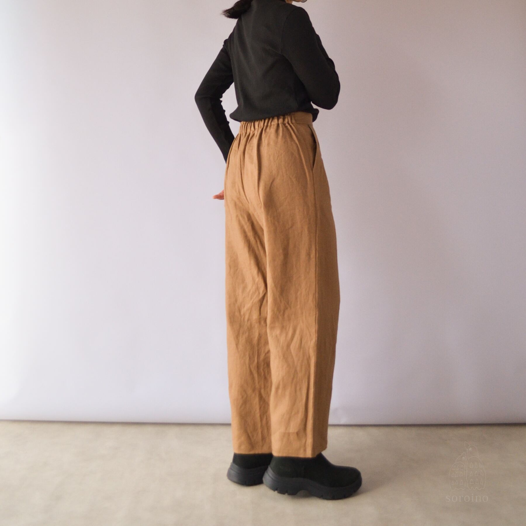 【リネン100%|丈オーダー可】美シルエット「ほどよいワイドパンツ」前側スッキリ&後ゴムで楽ちん ライトブラウン