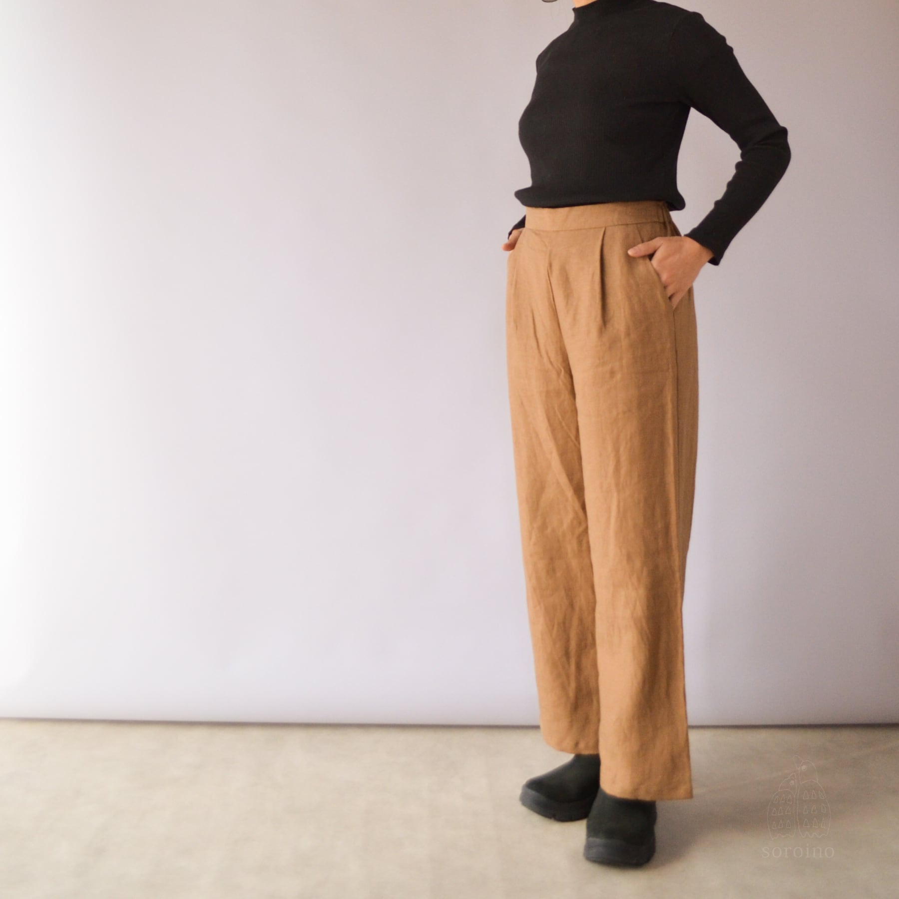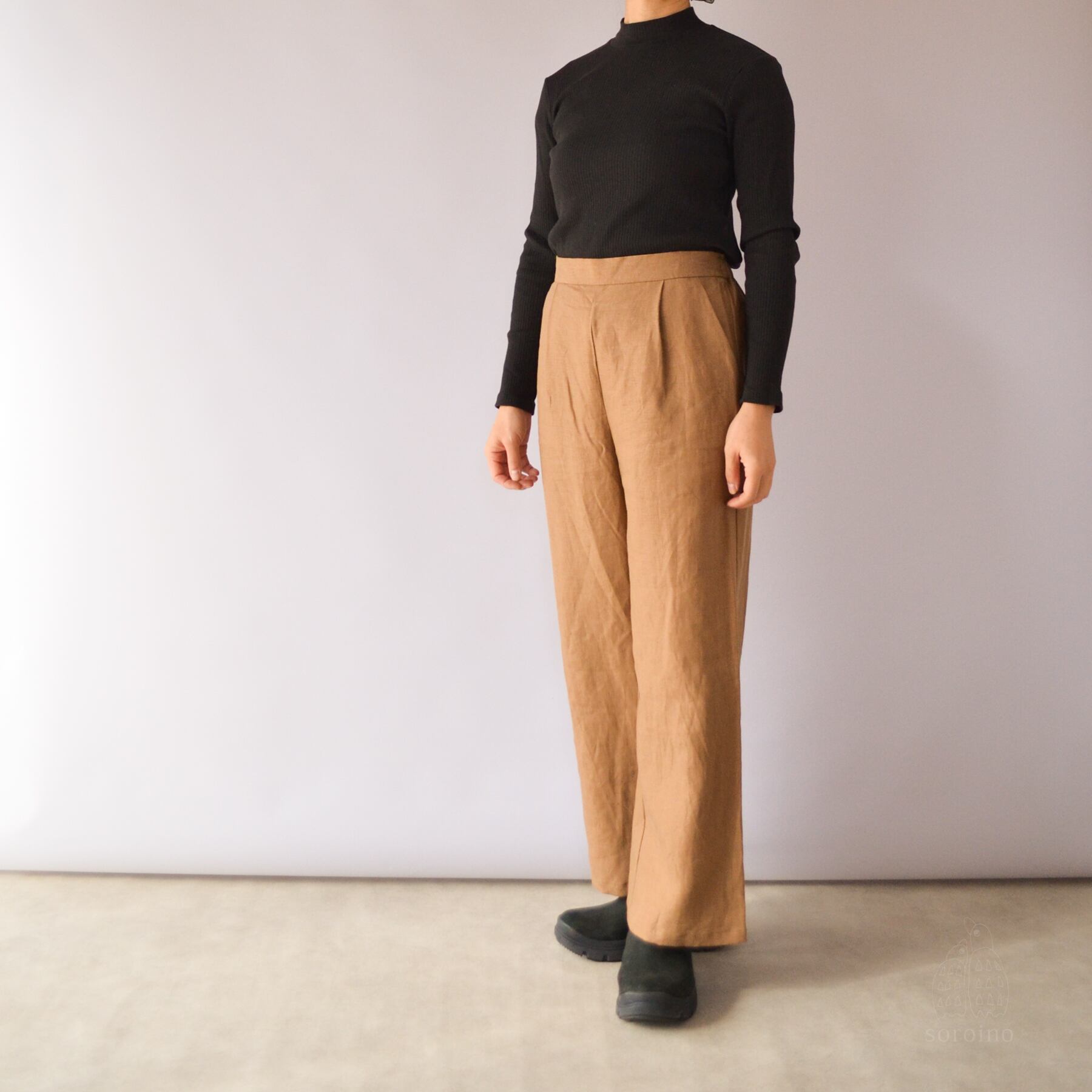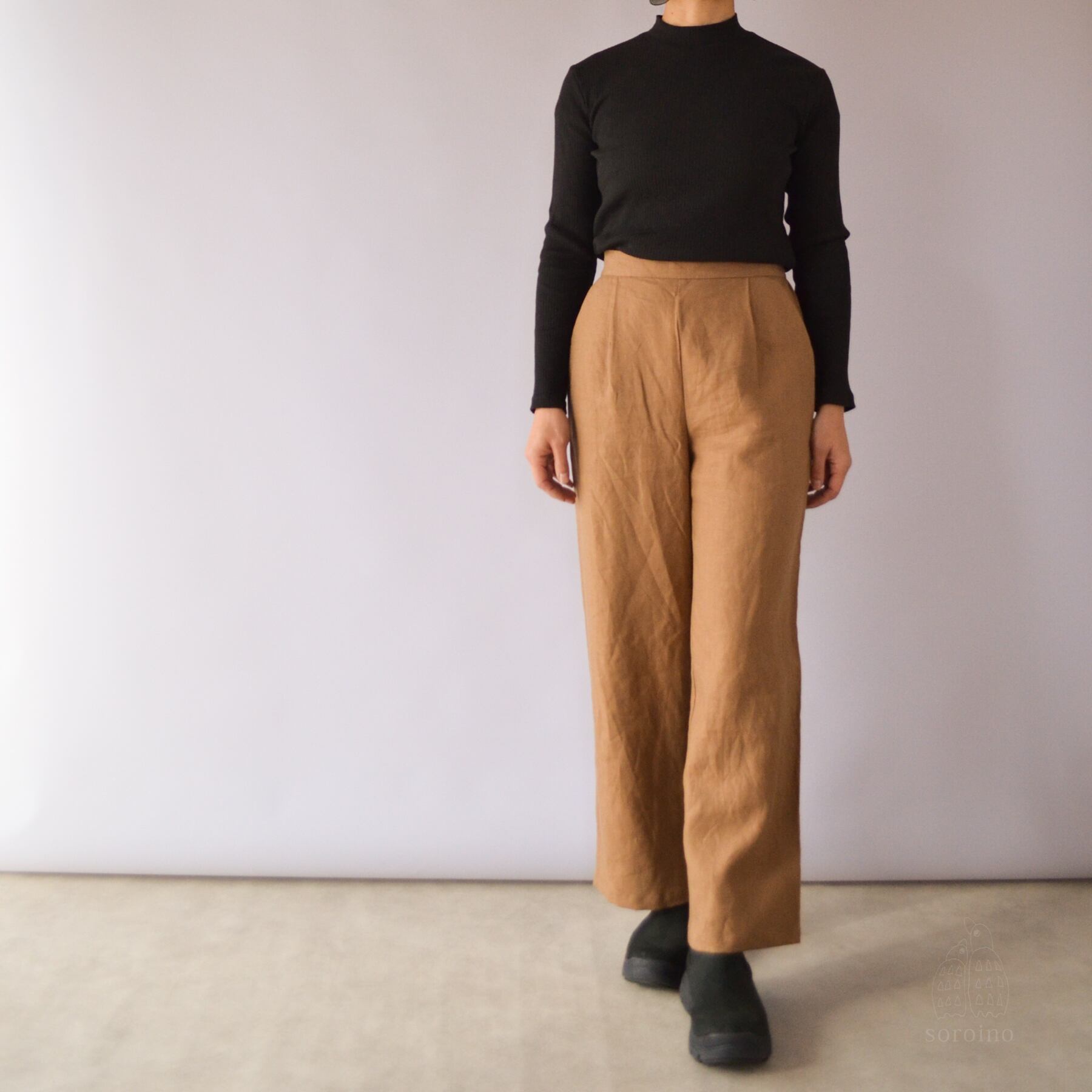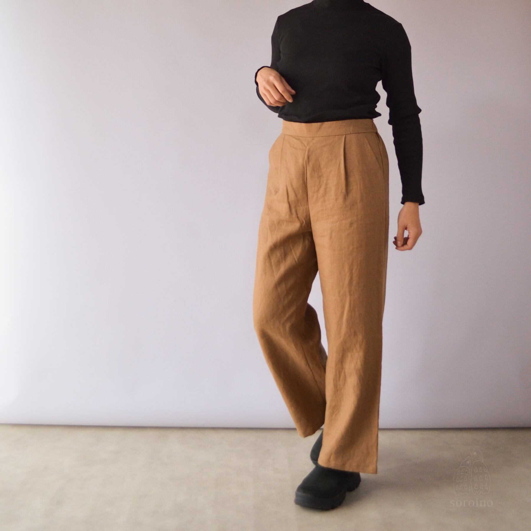【リネン100%|丈オーダー可】美シルエット「ほどよいワイドパンツ」前側スッキリ&後ゴムで楽ちん ライトブラウン