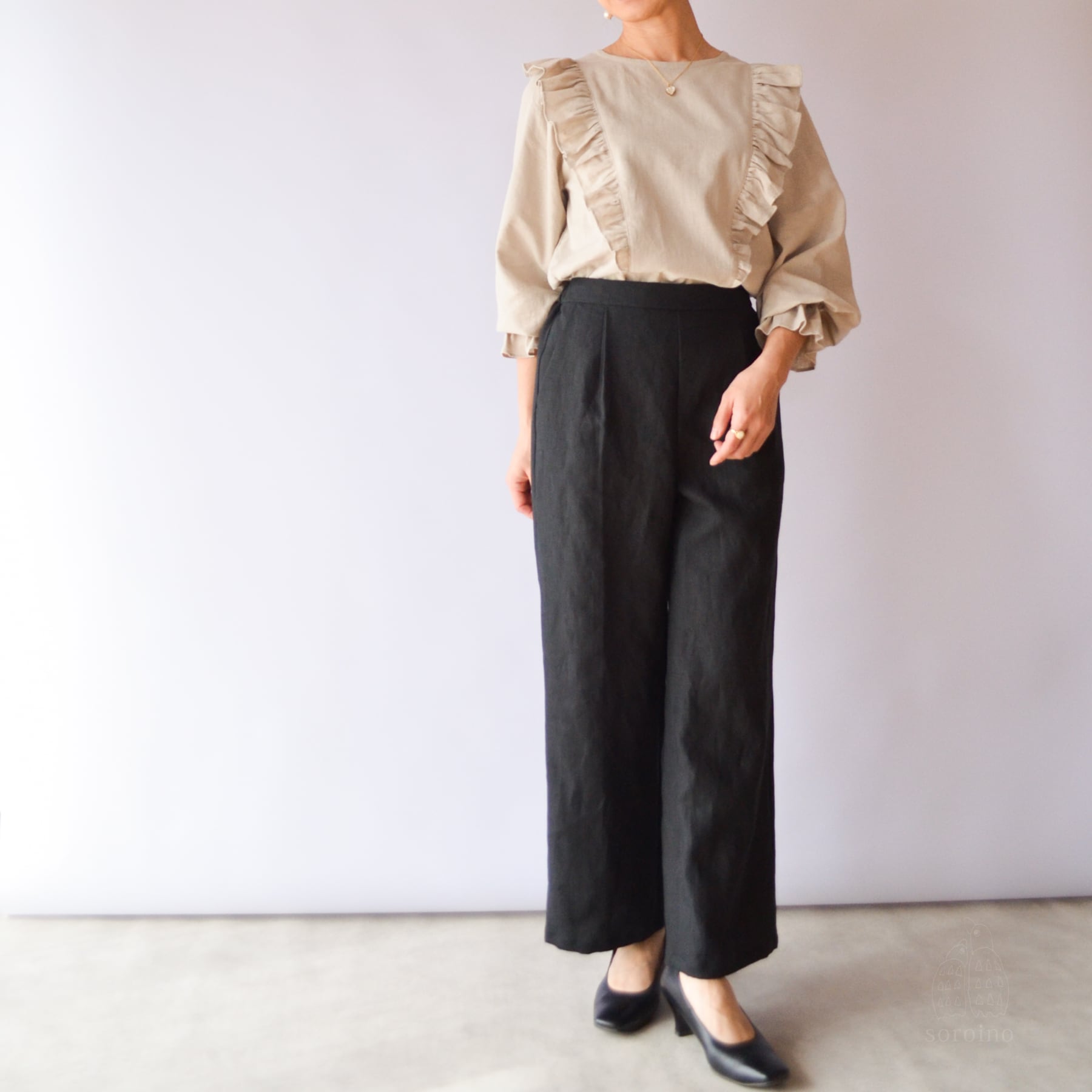 一緒にコーディネートしているベージュの「フリルブラウス」はこちら
