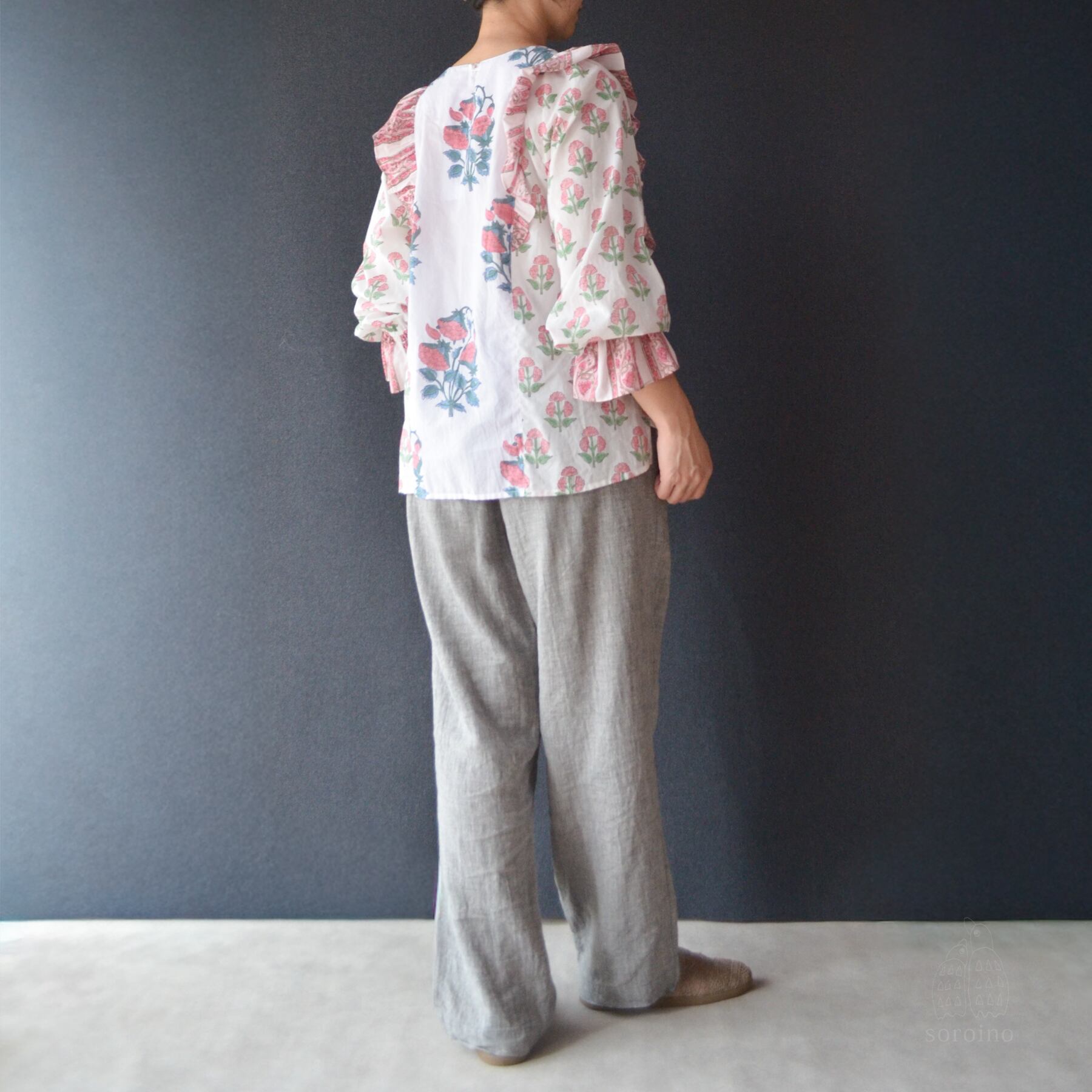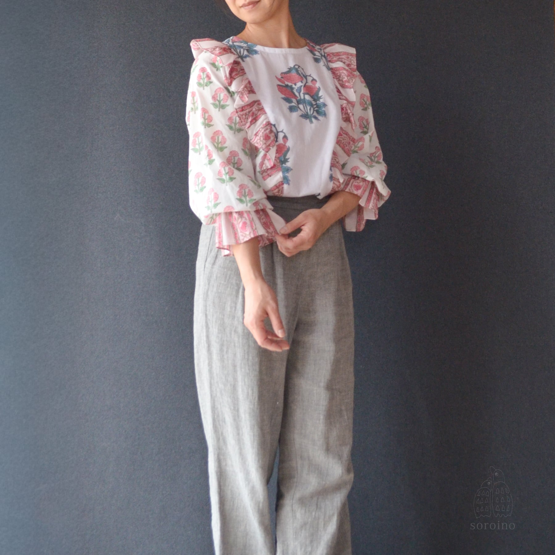 【限定1点】フリルブラウス|余白のあるブロックプリント ピンク