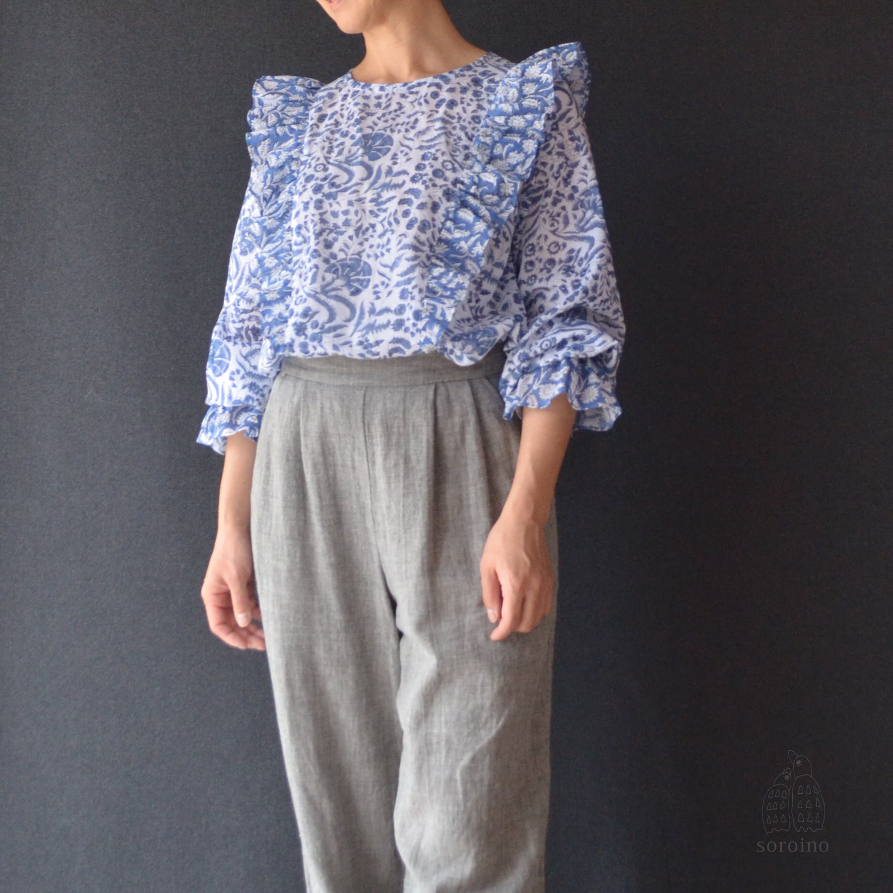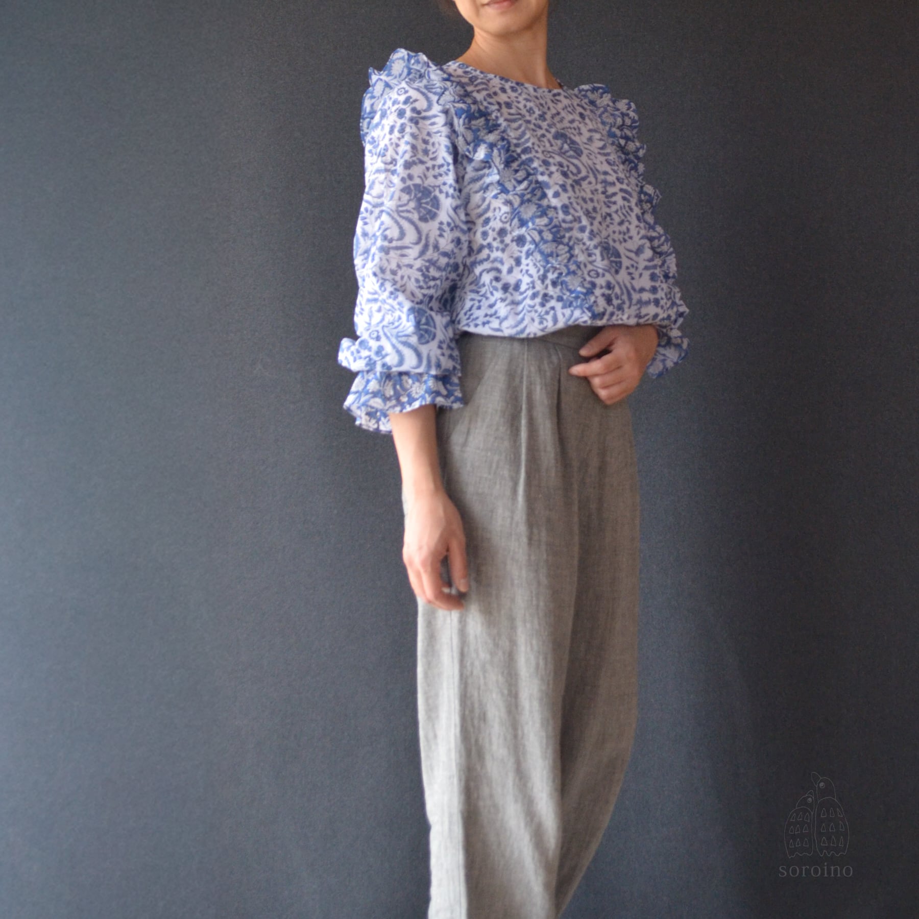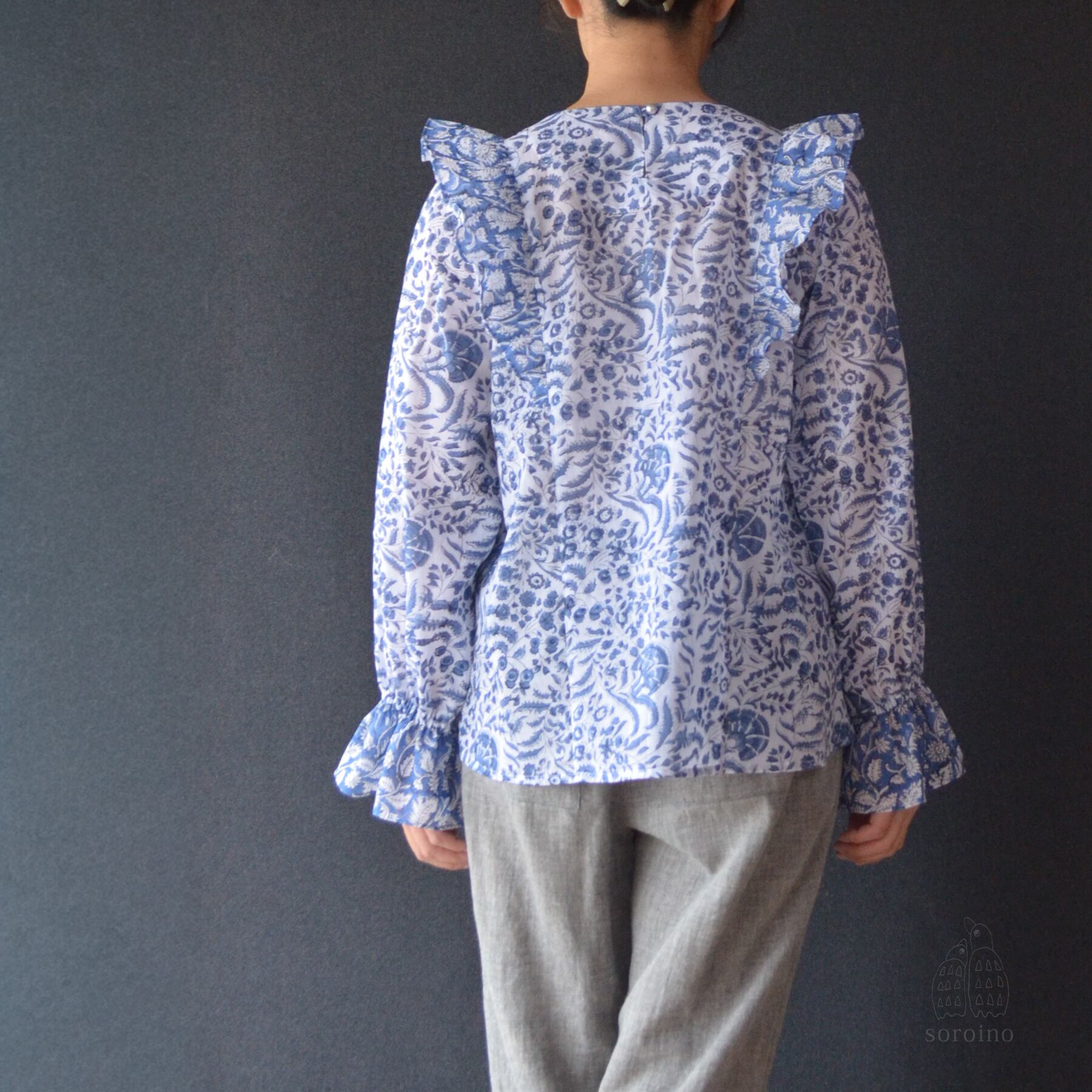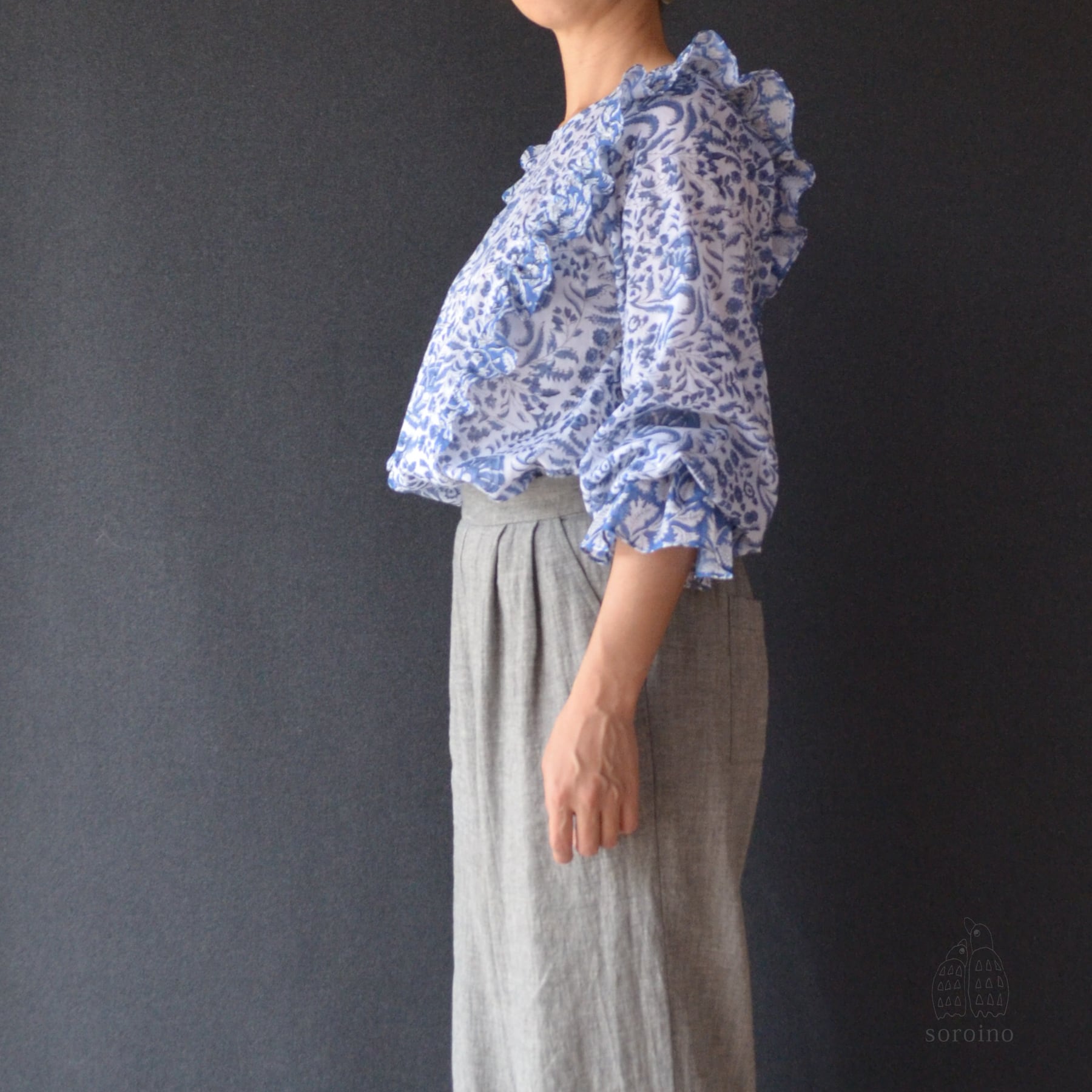 【限定1点】フリルブラウス|青華白磁のようなブロックプリント