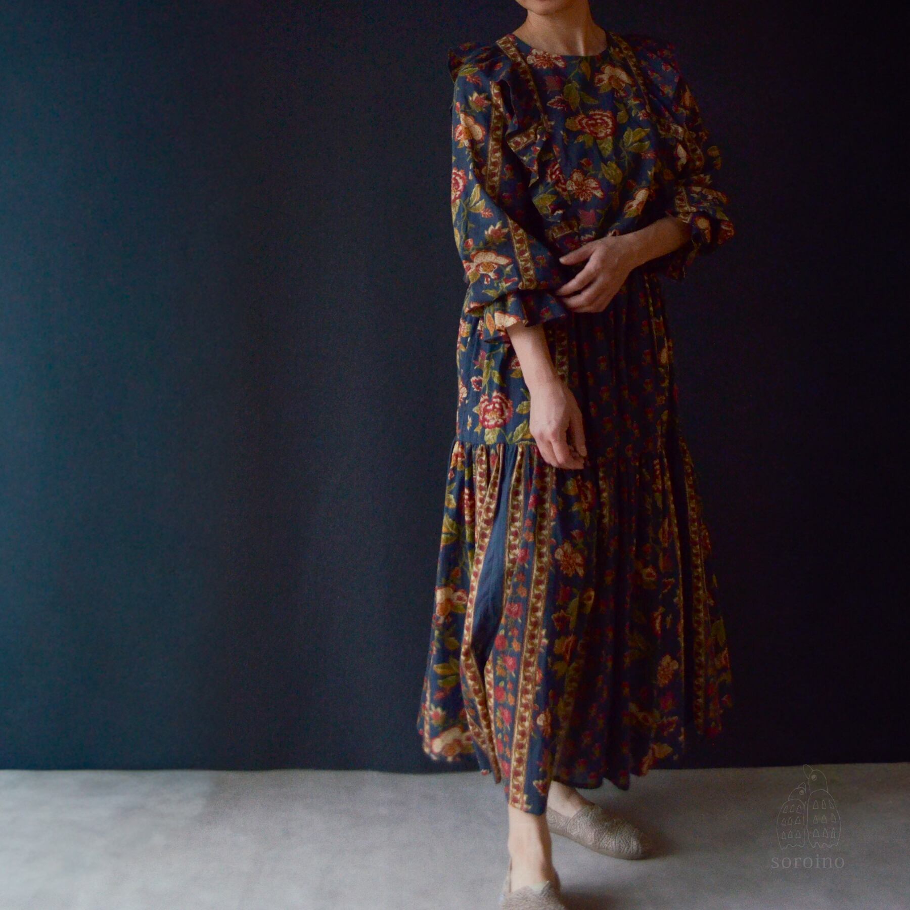 ☑︎ ブロックプリント生地はインドの職人さんの木版による手仕事で、模様をひとつひとつスタンプのようにプリントしていきます。その特徴として、インクのカスレ、飛び、柄ズレ、染料の匂いなどがあります。手仕事の味として親しまれておりますが、気になる方は購入をお控えください。